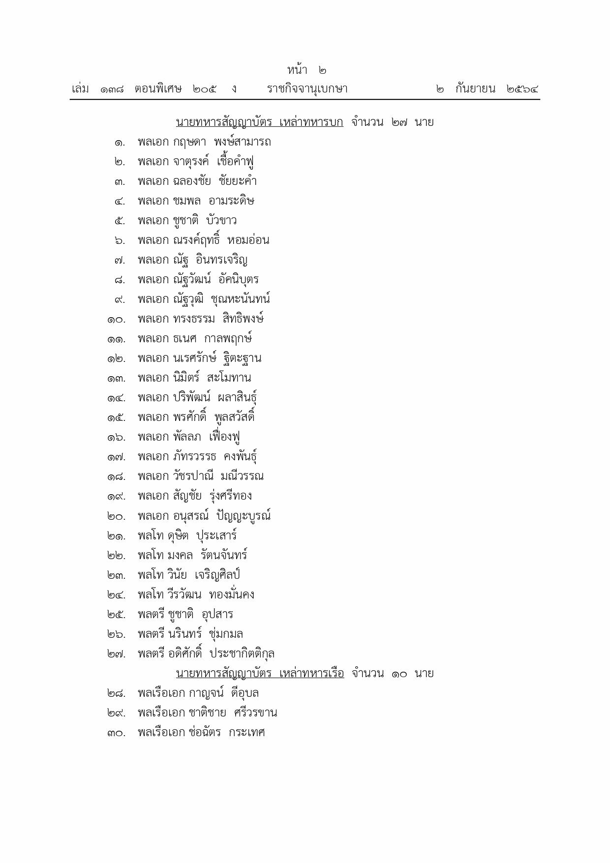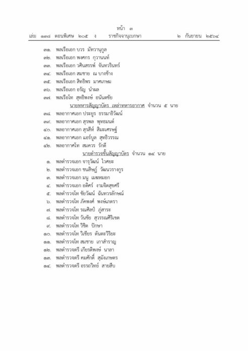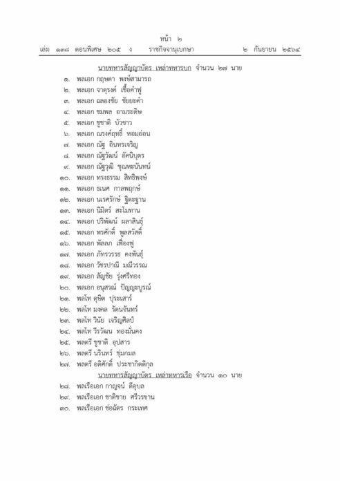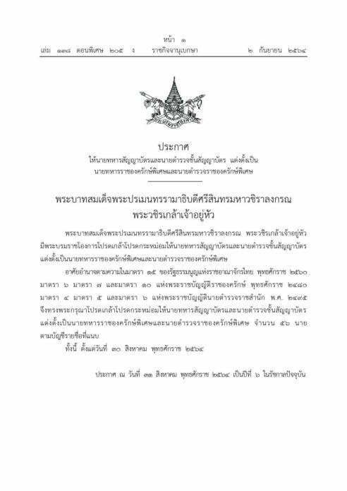 โปรดเกล้าฯ แต่งตั้งนายทหาร-ตำรวจชั้นสัญญาบัตร เป็นราชองครักษ์พิเศษ 56 นาย ตั้งแต่วันที่ 30 สิงหาคม พุทธศักราช 2564