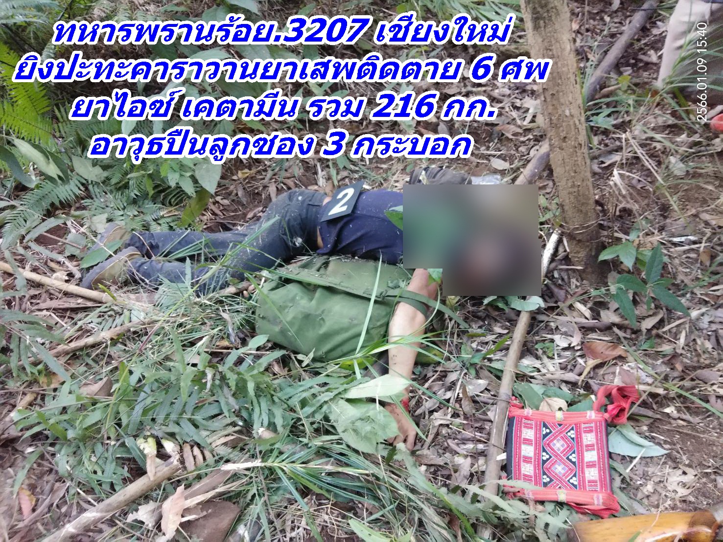 ทหารพรานร้อย.3207 เชียงใหม่ ยิงปะทะคาราวานยาเสพติดตาย 6 ศพ ยาไอซ์ เคตามีน รวม 216 กก.อาวุธปืนลูกซอง 3 กระบอก