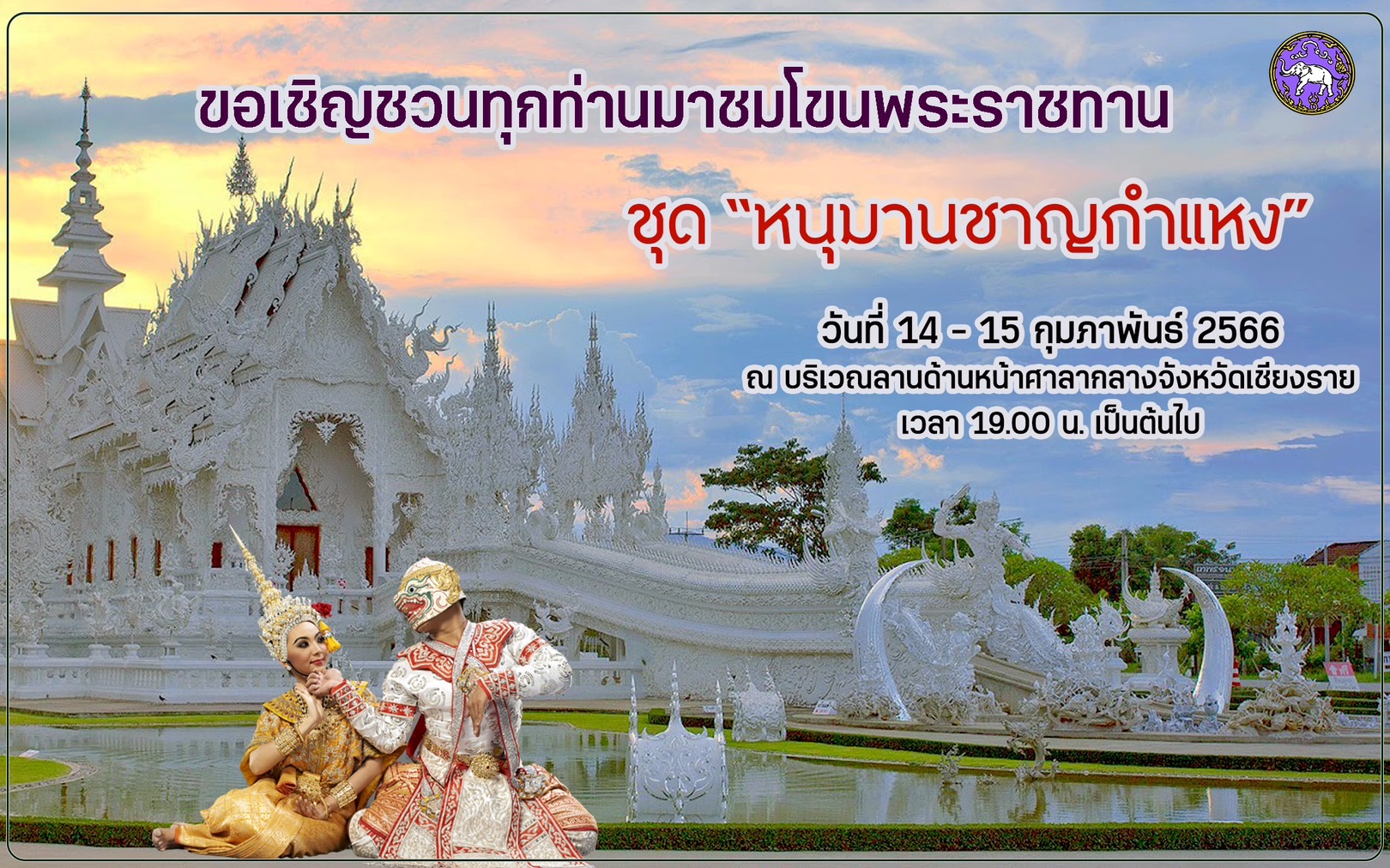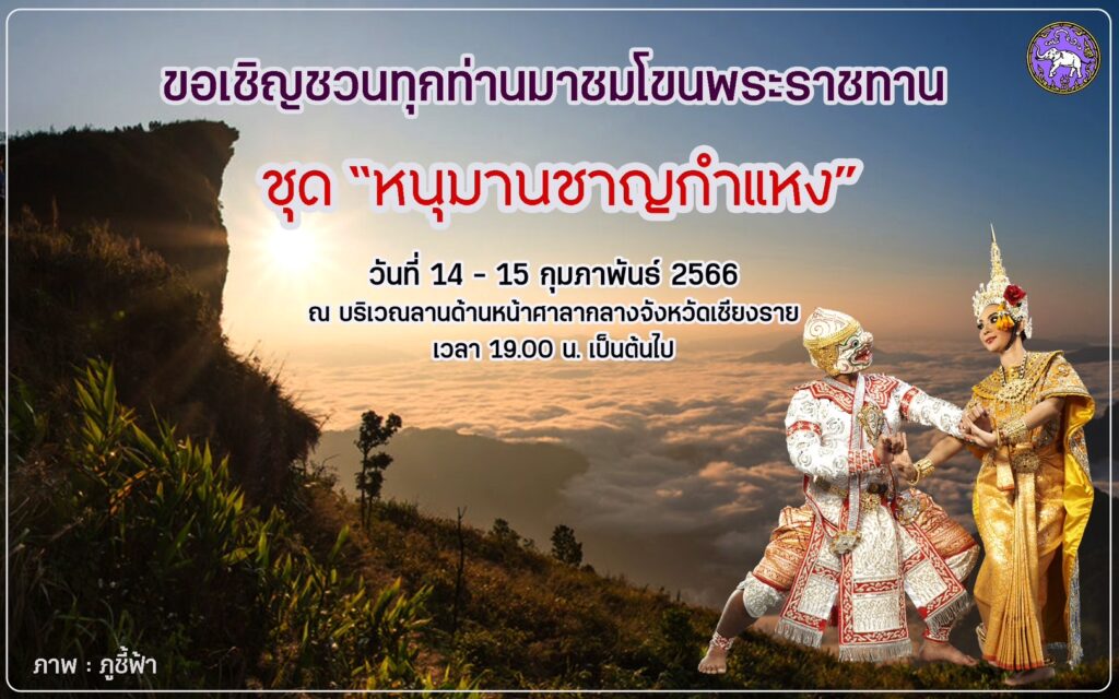 ขอเชิญชวนทุกท่านมาชมโขนพระราชทาน ชุด หนุมานชาญกำแหง ณ บริเวณลานด้านหน้าศาลากลางจังหวัดเชียงราย ในวันที่ 14-15 กุมภาพันธ์ 2566 ตั้งแต่เวลา 19.00 น. เป็นต้นไป