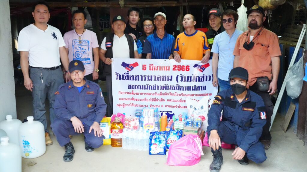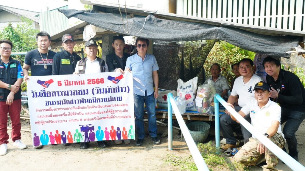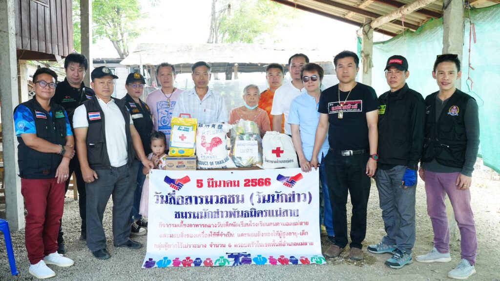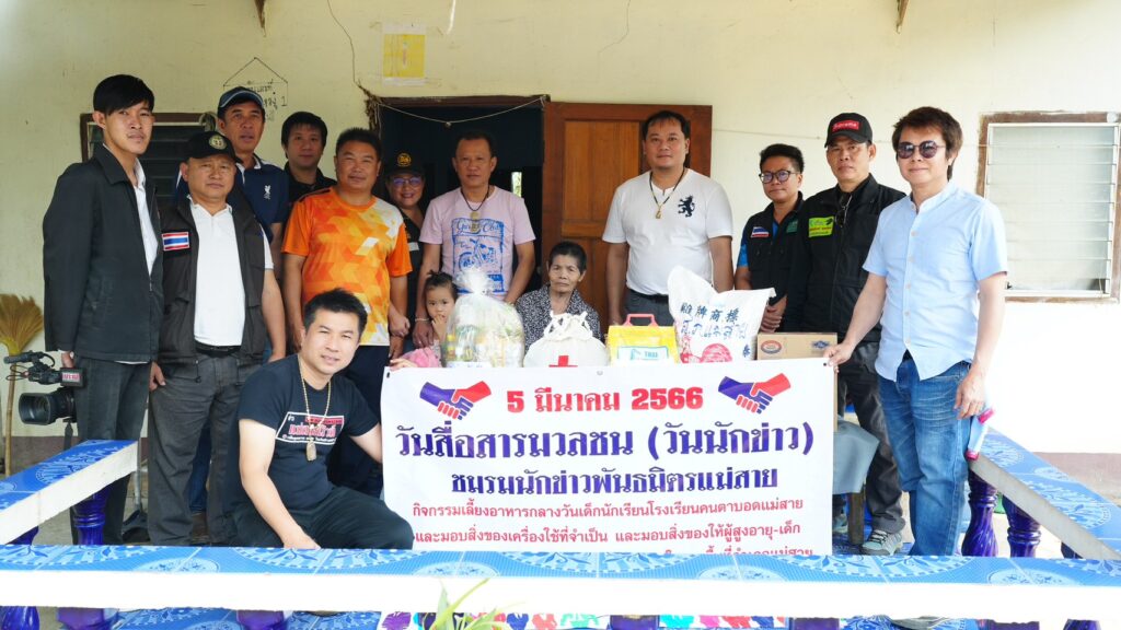 และมอบสิ่งของให้ครอบครัวกลุ่มผู้เปราะบาง ผู้ป่วยติดเตียง ผู้พิการ ผู้ป่วยจิตเวช ในพื้นที่ ต.เกาะช้าง ต.บ้านด้าย ต.ศรีเมืองชุม ต.เวียงพางคำ 4 ตำบล 7 ครัวเรือน เนื่องในกิจกรรมวันสื่อสารมวลชน (วันนักข่าว) 5 มีนาคม 2566 โดยทางชมรมข่าวพันธมิตรแม่สาย ได้จัดกิจกรรมเพื่อช่วยเหลือสังคมเป็นประจำของทุกๆ ปี ซึ่งในครั้งนี้ทางชมรมผู้สื่อข่าวพันธมิตรแม่สาย ได้จัดกิจกรรมบรรลุวัตถุประสงค์ตามเป้าหมายที่ได้วางไว้ จึงขอขอบพระคุณหน่วยงานภาครัฐ ภาคเอกชน พีน้องประชาชน ห้างร้าน ที่ได้สนับสนุนกิจกรรมดีๆ ในครั้งนี้ และขออำนาจคุณพระศรีพระรัตนตรัยตลอดจนสิ่งศักดิ์สิทธิ์ในสากลโลกจงดลบันดาลให้ท่าน และครอบครัวประสบแต่สุขความเจริญ อายุ วรรณะ สุขะ พละ ตลอดไปเทอญ…..