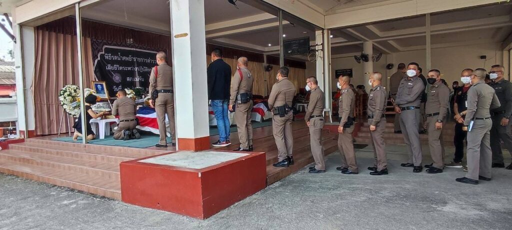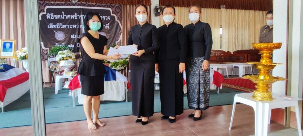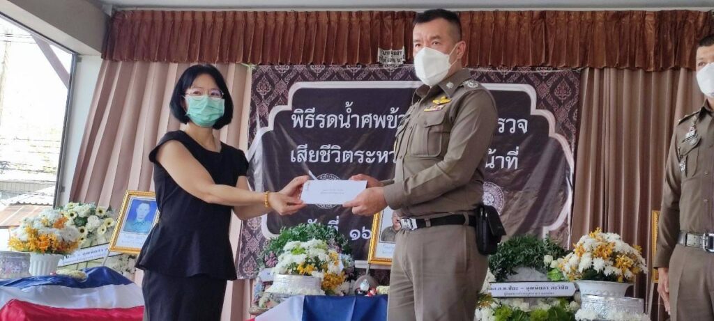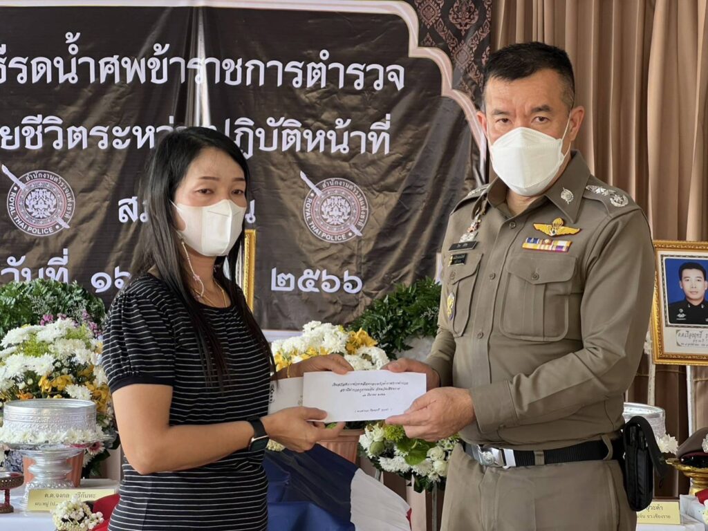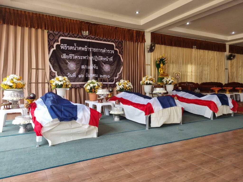 วันที่ 16 มีนาคม 2566 เวลา 14.30 น. พล.ต.ท.ปิยะ ต๊ะวิชัย ผบช.ภ5 ได้เป็นประธานในพิธีรดน้ำศพให้กับข้าราชการตำรวจประกอบ ด้วย ด.ต.เรืองฤทธิ์ ธุวะคำ ผบ.หมู่ (ป) สภ.แม่จัน ด.ต.พิชยพล จันทร์ต๊ะ ผบ.หมู่ (ป) สภ.แม่จัน และ ด.ต.จงกล ศรีกันทะ ผบ.หมู่ (ป) สภ.แม่จัน ซึ่งทั้งสามนายได้เสียชีวิตในระหว่างการปฏิบัติหน้าที่ เมื่อช่วงหัวค่ำของวันที่ 15 มีนาคม 2566 ที่ผ่านมา ซึ่งวันนี้ได้จัดพิธีรดน้ำศพให้กับข้าราชการตำรวจทั้ง 3 นาย ณ วัดกาสา อ.แม่จัน จ.เชียงราย โดยมี พ.ต.อ.สันติ กองสมัคร รรท.ผบก.จ.เชียงราย นายวรายุทธ ค่อมบุญ นายอำเภอแม่จัน พ.ต.อ.ทรรศ์ธนสรณ์ จุฑารัตน์ ผกก.สภ.แม่จัน และผู้บังคับบัญชาในสกัด สภ.แม่จัน ตลอดจนเพื่อนข้าราชการตำรวจร่วมพิธีรดน้ำศพในครั้งนี้บริเวณศาลาการเปรียญ วัดกาสา ทั้งนี้ พล.ต.ท.ปิยะ ต๊ะวิชัย ผบช.ภ.5 ได้มอบเงินช่วยเหลือซึ่งเป็นสวัสดิการของตำรวจภูธรภาค 5 ประกอบด้วยเงินกองทุนสวัสดิการตำรวจภูธรภาค 5 จำนวน 20,000 บาท เงินทุนสมเด็จพระศรีนครินทราบรมราชชนนี จำนวน 3,000 บาท และเงินกองทุนสวัสดิการ สภ.แม่จัน จำนวน 10,000 บาท ไว้เป็นเบื้องต้นให้กับครอบครัวของผู้เสียชีวิต และได้ประสานสวัสดิการต่างๆ ที่ตำรวจทั้ง 3นายพึ่งได้รับเพิ่มเติม โดยทางตำรวจภูธรภาค 5 จะได้เสนอขอบำเหน็จความชอบเป็นกรณีพิเศษให้กับข้าราชการตำรวจทั้งสามนายที่เสียชีวิตจากการปฎิบัติหน้าที่ โดยจะเสนอขอเลื่อน เงินเดือน 3 ขั้น และขอเลื่อนยศ 3 ชั้นยศ จาก ด.ต. เป็น ร.ต.อ. เพื่อตอบแทนคุณงามความดีที่ทั้งสามนายที่ได้ปฎิบัติหน้าที่ของข้าราชการตำรวจในระหว่างที่ยังมีชีวิตอยู่