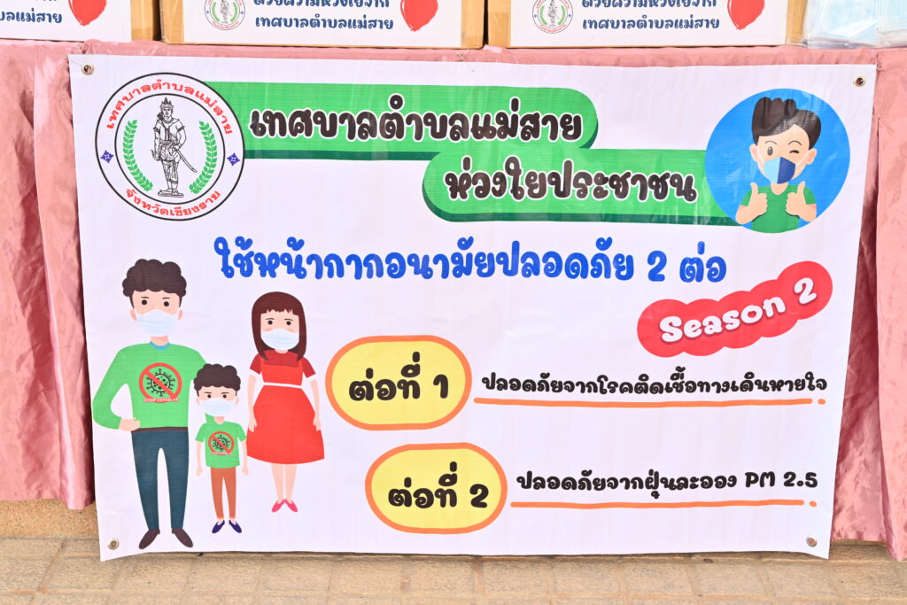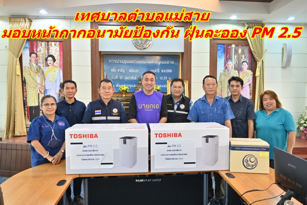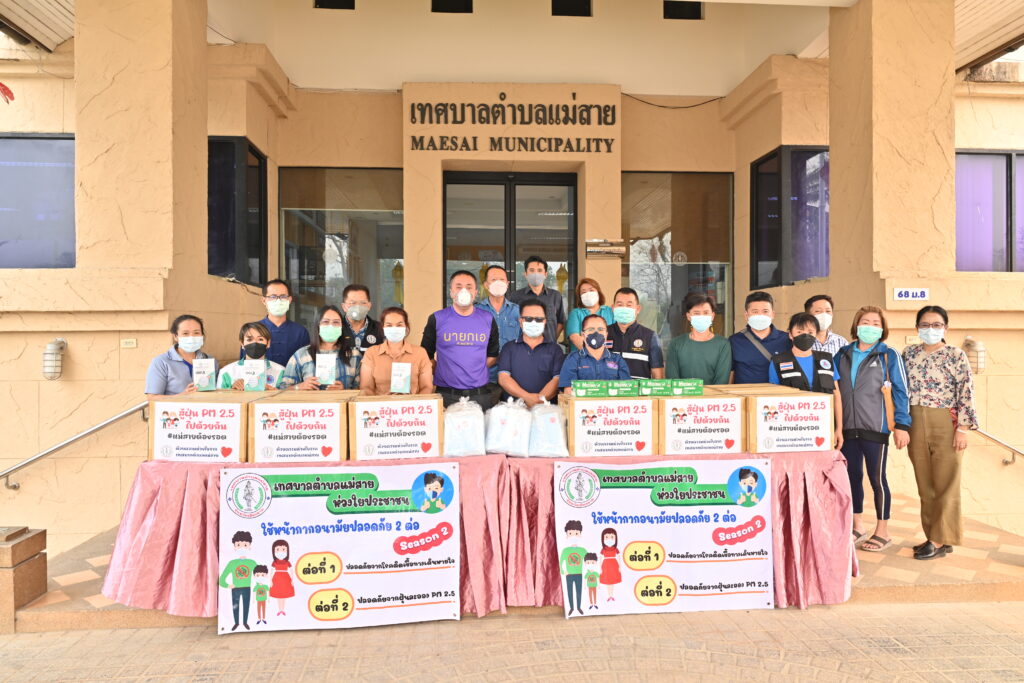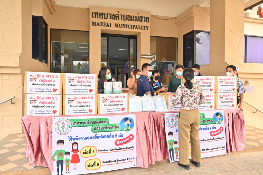 เทศบาลตำบลแม่สาย ได้มอบหน้ากากอนามัยป้องกัน ฝุ่นละออง PM 2.5 ให้แก่ตัวแทน อสม.ของชุมชนพื้นที่เทศบาลตำบลแม่สาย เพื่อนำไปแจกให้กับประชาชนในพื้นที่ และมอบหน้ากากป้องกันฝุ่น PM 2.5 (CUre Air Sure) ซึ่งเป็นผลงานวิจัยและนวัตกรรมทางด้านความปลอดภัยทางสุขภาพจากคณะวิศวะกรรมศาสตร์ จุฬาลงกรณ์มหาวิทยาลัย โดยได้รับมอบจาก ผศ.ดร.นิอร สิริเลิศมงคลชัย หัวหน้าโครงการวิจัยห้องเรียนสู้ฝุ่น ให้แก่ตัวแทนสื่อมวลชนในพื้นที่อำเภอแม่สาย เพื่อแจกจ่ายให้กับสื่อมวลชนที่ปฎิบัตหน้าที่ในภาวะเสี่ยงของ ฝุ่น PM 2.5 และ กระทรวงการอุดมศึกษา วิทยาศาสตร์ วิจัยและนวัตกรรม (อว.) มหาวิทยาลัยแม่ฟ้าหลวง ร่วมกับ บริษัท โตชิบา ไทยแลนด์ จำกัด มอบเครื่องฟอกอากาศ ให้กับเทศบาลตำบลแม่สาย สถานศึกษาและศูนย์พัฒนาเด็กเล็กในสังกัดเทศบาลตำบลแม่สาย รวมจำนวน 11 เครื่อง เพื่อใช้ปรับคุณภาพอากาศใหักับเด็ก นักเรียนและประชาชนผู้มาใช้บริการ