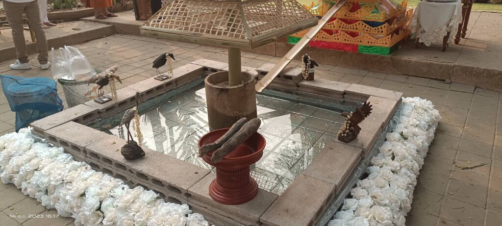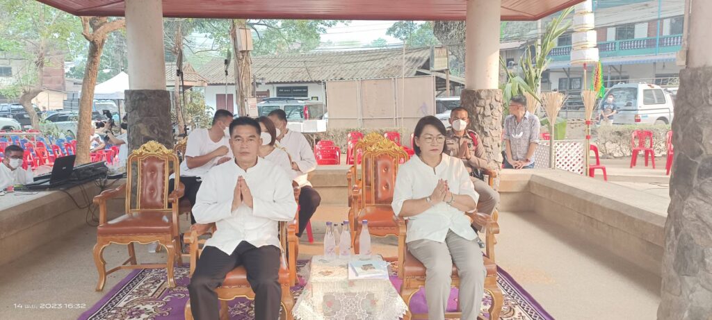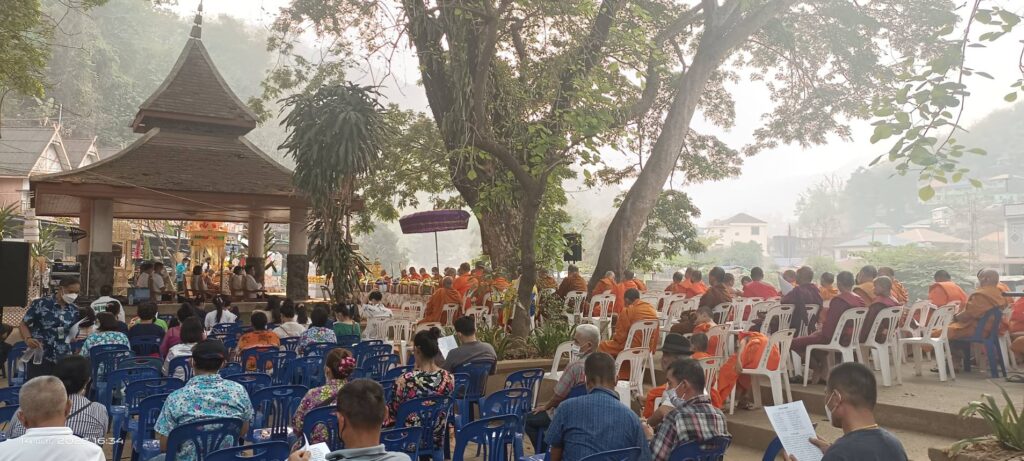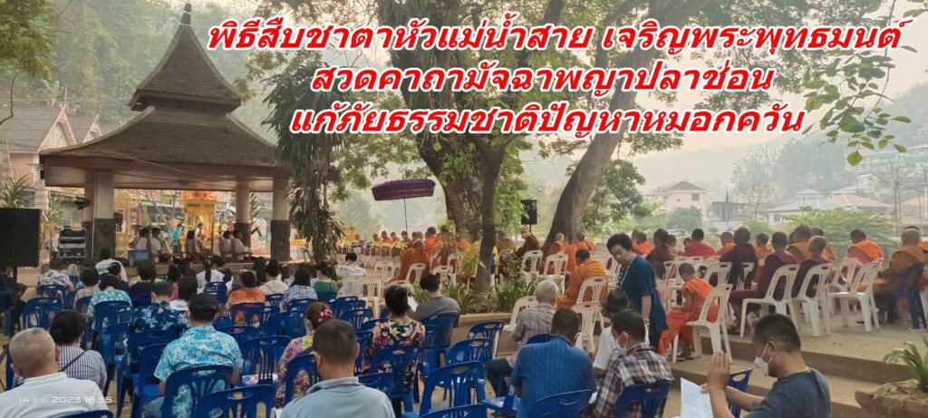 เมื่อวันศุกร์ที่ 14 เม.ย. 66 เวลา 16.00 น. นายณรงค์พล คิดอ่าน นายอำเภอแม่สาย ประธานฝ่ายฆราวาส พระเดชพระคุณหลวงพ่อพระพุทธิวงศ์วิวัฒน์ (บุญมา มานิโต) รักษาการเจ้าอาวาสวัดพระธาตุดอยตุง ปรึกษาเจ้าคณะจังหวัดเชียงราย (ประธานในพิธีฝ่ายสงฆ์) พร้อมด้วย พระครูวิสุทธิธรรมภาณี เจ้าคณะอำเภอแม่สาย อาจารย์สุเทพ ไชยสุรินทร์ พราหมฌ์เจ้าพิธี และหัวหน้าหน่วยงานส่วนราชการ หน่วยงานภาครัฐภาคเอกชน องค์กรปกครองส่วนท้องถิ่น สภาวัฒนธรรม กำนันผู้ใหญ่บ้านตำบลเวียงพางคำ พีน้องประชาชนแม่สาย ได้เข้าร่วมในพิธีกรรมเจริญพระพุทธมนต์ สวดปริตร์พระคาถาขอฝน และสวดพระคาถามัจฉาพญาปลาช่อน พระคาถามหาเมฆ ร่วมกว่า 4 ชั่วโมง ณ บริเวณหัวแม่น้ำสาย (จุดผ่อนปรนหัวฝ่าย) ม.1 ต.เวียงพางคำ อ.แม่สาย จ.เชียงราย ตามความเชื่อที่ถือปฏิบัติกันมาช้านาน ซึ่งเป็นพิธีกรรมในการแสดงพระธรรมเทศนาดังกล่าวของคัมภีร์ประเภทชาดกของพุทธศาสนิกชนชาวไทยล้านนา เพื่อแก้ปัญหาภัยธรรมชาติปัญหาวิกฤตหมอกควันในเมืองตะเข็บชายแม่สาย และในจังหวัดเชียงรายที่ได้รับผลกระทบวิกฤตหนักในรอบ 10 ที่ผ่านมา