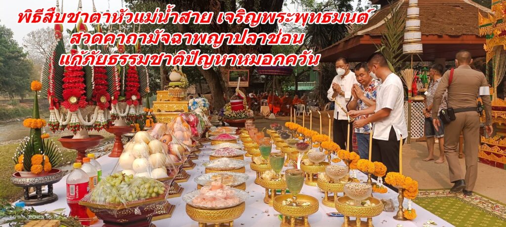 พิธีสืบชาตาหัวแม่น้ำสาย เจริญพระพุทธมนต์ สวดคาถามัจฉาพญาปลาช่อน แก้ภัยธรรมชาติปัญหาหมอกควัน