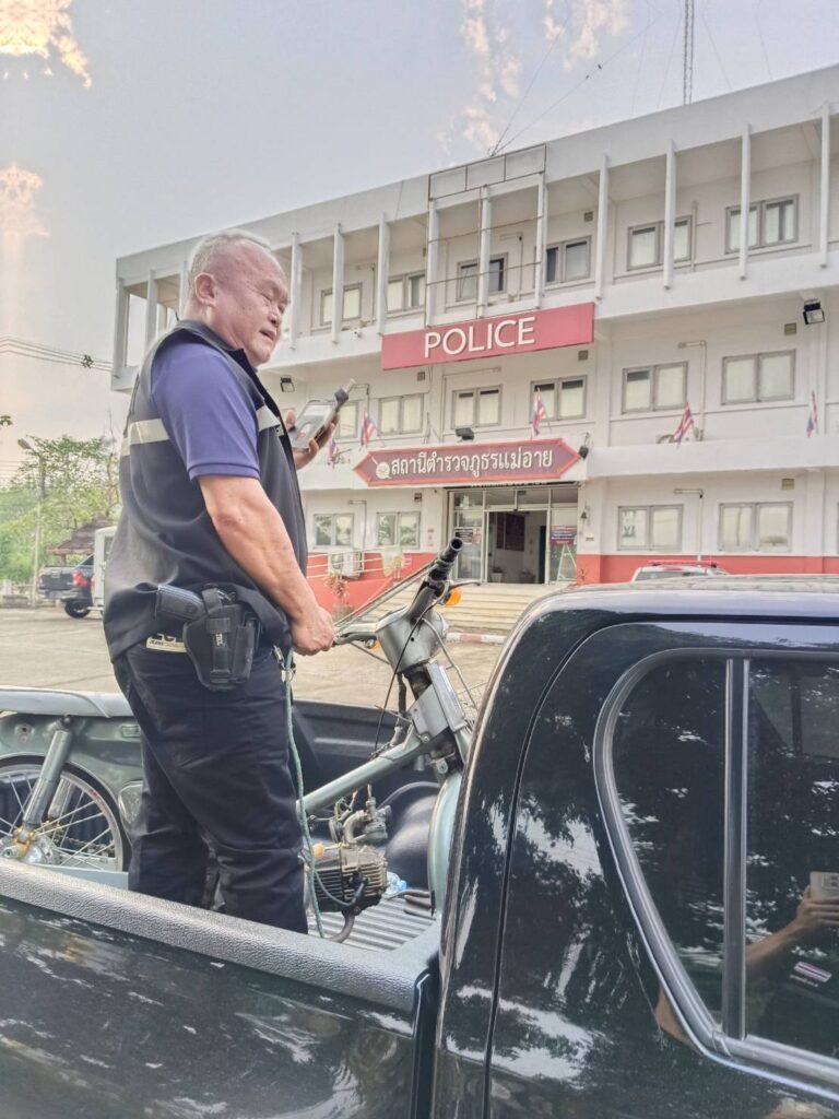 สืบเนื่องเมื่อวันที่ 25 เม.ย.66 เวลา 10.30 น. ได้มีชายฉกรรจ์ สวมเสื้อแขนสั้นลายสีม่วงสวมกางเกงสามส่วนสีดำที่น่องขามีรอยสัก ได้ก่อเหตุลักรถจักยานยนต์ ยี่ห้อ ฮอนด้า รุ่น C70 สีเขียวอ่อน หมายเลขทะเบียน ว 8091 เชียงราย ที่เจ้าของจอดเอาไว้ในขณะที่เจ้าของรถคันดังกล่าวเข้าร่วมประชุมที่ศาลาการเปรียญวัด บ.สันถนน ต.ศรีเมืองชุม อ.แม่สาย จ.เชียงราย โดยใกล้บริเวณที่เกิดเหตุ พบรถจักรยานยนต์ ยี่ห้อ ฮอนด้า เวฟ 101สีน้ำเงิน+ดำ (สภาพเก่า) คาดว่าเป็นรถของคนร้ายจอดทิ้งไว้ ผู้เสียหายซึ่งได้เข้าแจ้งความลงบันประจำวันต่อพนักงานสอบสวน สภ.เกาะช้างแม่สาย