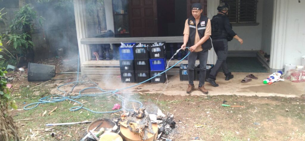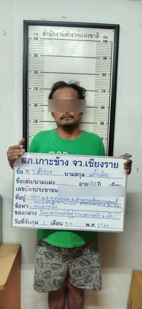 วันนี้ 1 พฤษภาคม พ.ศ. 2566 เวลา 10.00 น. พ.ต.อ.ปวีณ ทองสมบูรณ์ ผกก.สภ.เกาะช้าง ได้รับแจ้งจากชาวบ้าน บ.สันถนนใต้ ม.2 ต.ศรีเมืองชุม อ.แม่สาย จ.เชียงราย ว่ามีชายฉกรรจ์คลุ้มคลั่งอาการเหมือนคนเสพสารเสพติด บริเวณบ้านเช่า เลขที่ 211 ม.2 ต.ศรีเมืองชุม จึงได้สั่งการให้ พ.ต.ท.เจริญชัย จารุแพทย์ รอง ผกก.ป.สภ.เกาะช้าง พ.ต.ต.กฤตกรณ์ กันจินะ สว.สส.สภ.เกาะช้าง พร้อมเจ้าหน้าที่ชุดสายตรวจ 191 รุดไปตรวจสอบตามที่ได้รับแจ้ง เมื่อไปถึงบริเวณบ้านเช่าหลังดังกล่าว พบนางปัทมา แก้วน้อย อายุ 36 ปี ยืนอยู่หน้าบ้านหลังดังกล่าวเพื่อขอความช่วยเหลือจากทางเจ้าหน้าที่ และภายในบ้านได้มีการจุดไฟเผาสิ่งของต่างๆ และมีขวดเบียร์เปล่าแตกกระจายบริเวณลานบ้าน ซึ่งนางปัทมาฯ ได้บอกกับทางเจ้าหน้าที่ว่า นายสำรวย แก้วน้อย อายุ 42 ปี อยู่บ้านเลขที่ 19/7 ม.4 ต.หนองไผ่ อ.ด่านมะขามเตี้ย จ.กาญจนบุรี ซึ่งสามีของตนที่มีอาการคลุ้มคลั่งพูดจาวกวน ได้แอบซ่อนตัวอยู่ในห้องนอน ทางเจ้าที่จึงได้เข้าเกลี้ยกล่อมนายสำรวยฯ เพื่อให้สงบสติอารมณ์ แล้วยินยอมเปิดประตูให้เจ้าหน้าที่เข้าไปตรวจสอบบริเวณในห้องและรอบๆบ้าน หลังดังกล่าว ต่อมาหน้าเจ้าหน้าที่ได้ตรวจพบยาบ้าจำนวน 2 เม็ด ชนิดกลมแบน สีแดง ประทับตรา WY ซุกซ่อนอยู่ในกระเป๋าสะพายสีน้ำตาล และอาวุธปืนสั้นไทยประดิษฐ์ ขนาด 12 จำนวน 1 กระบอก ซุกซ่อนห่ออยู่ในผ้าสีขาวในถุงเก็บเสื้อผ้า ซึ่งนายนายสำรวย มีอาการกระวนกระวาย และรับว่าเสพยาบ้ามาก่อนหน้านี้ ทางเจ้าหน้าที่จึงได้ส่งตัวอย่างปัสสาวะไปตรวจสารเสพติดที่ รพ.แม่สาย ได้ผลตรวจยืนยันของทางการแพทย์ พบสารเสพติดชนิดเมทแอมเฟตามีน อยู่ในร่างกายของผู้ต้องหา เจ้าหน้าที่ชุดจับกุมจึงได้แจ้งข้อกล่าวหาให้ทราบว่า มียาเสพติดให้โทษไว้เพื่อเสพ และมีอาวุธสั้นไทยประดิษฐ์ที่ไม่มีทะเบียนไว้ในครอบครองโดยไม่ได้รับอนุญาต พร้อมนำผู้ต้องหา และของกลางส่งพนักงานสอบสวน สภ.เกาะช้างนำดำเนินคดี…