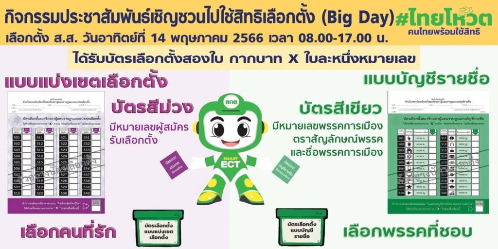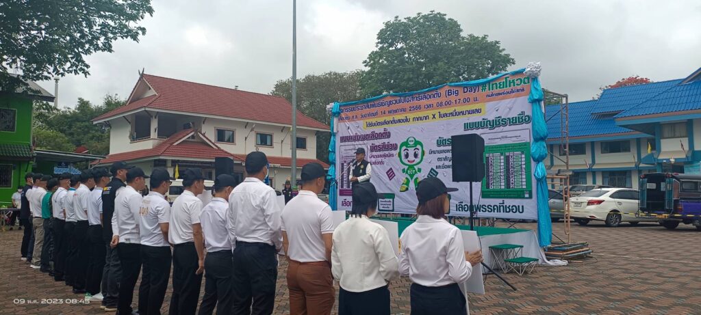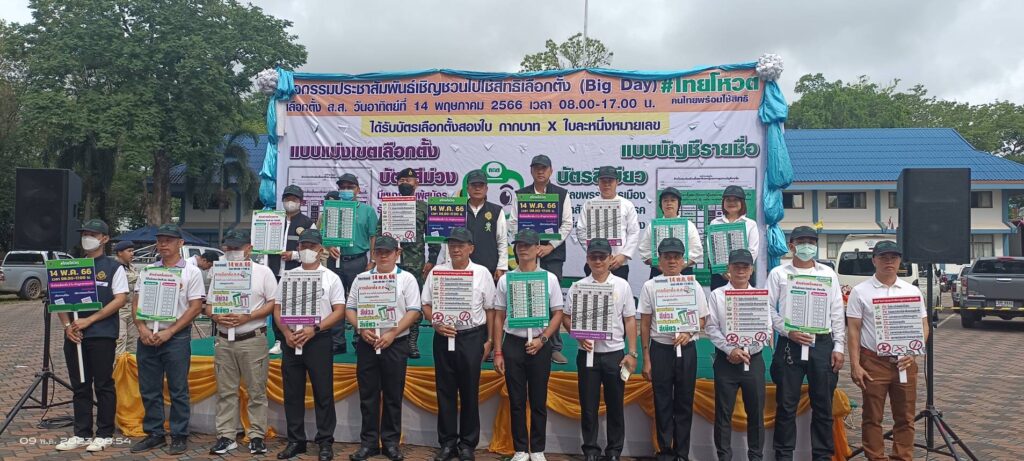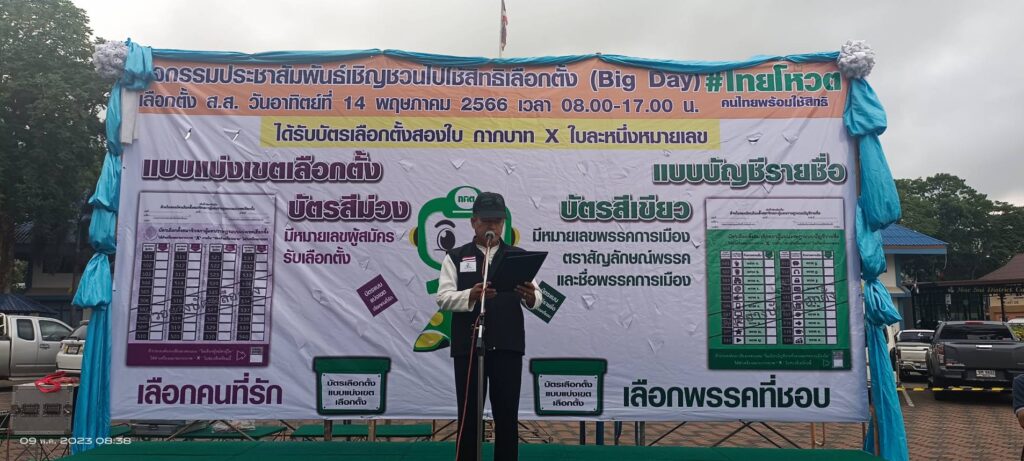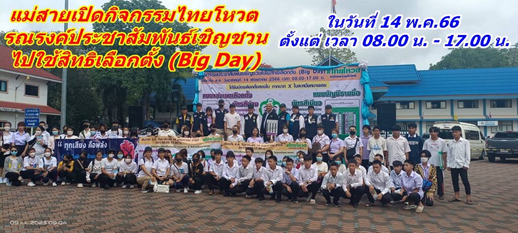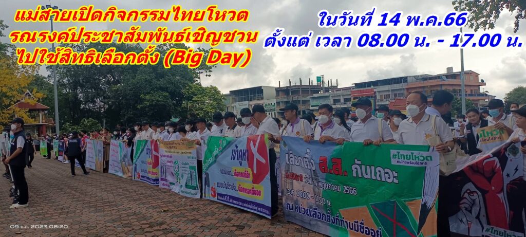 เมื่อวันที่ 9 พ.ค.66 เวลา 08.30 น. นายณรงค์พล คิดอ่าน นายอำเภอแม่สาย ประธานกรรมการการเลือกตั้งเขต 6 จังหวัดเชียงราย พร้อมด้วย อนุกรรมการการเลือกตั้ง คณะกรรมการการเลือกตั้ง หัวหน้าหน่วยงานข้าราชการ องค์กรปกครองส่วนท้องถิ่น ภาครัฐภาคเอกชน กำนันผู้ใหญ่บ้าน นักเรียนนักศึกษา ได้ร่วมพลังปล่อยแถวไทยโหวต รณรงค์ประชาสัมพันธ์เชิญชวนไปใช้สิทธิเลือกตั้ง (Big Day) สมาชิกสภาผู้แทนราษฎรเขต 6 จังหวัดเชียงราย พ.ศ.2566 ณ ลานหน้าที่ว่าการอำเภอแม่สาย จังหวัดเชียงราย ในวันอาทิตย์ที่ 14 พ.ค.66 ตั้งแต่เวลา 08.00 น. – 17.00 น. ณ ประจำหน่วยเลือกตั้งของท่านที่ใช้สิทธิ์เลือกตั้งสมาชิกสภาผู้แทนราษฎรเขต 6 จังหวัดเชียงราย โดยมีผู้มีสิทธิ์เสียงดังนี้ อำเภอแม่สาย (ยกทั้งอำเภอ) มี 8 ตำบล 1.เทศบาลตำบลแม่สาย 2.เทศบาลตำบลแม่สายมิตรภาพ 3.เทศบาลตำบลเวียงพางคำ 4.เทศบาลตำบลห้วยไคร้ 5.ตำบลเกาะช้าง 6.ตำบลศรีเมืองชุม 7.ตำบลโป่งผา 8.ตำบลโป่งงาม 9.ตำบลบ้านด้าย 10.ตำบลห้วยไคร้ รวมมีผู้ที่มีสิทธิ์อำเภอแม่สาย จำนวน 78,307 คน อำเภอแม่ฟ้าหลวง (ยกทั้งอำเภอ) มี 4 ตำบล 1.ตำบลเทอดไทย 2.ตำบลแม่สลองใน 3.ตำบลแม่สลองนอก 4.ตำบลแม่ฟ้าหลวง รวมมีผู้ที่มีสิทธิ์อำเภอแม่ฟ้าหลวง จำนวน 57,084 คน ส่วนอำเภอแม่จัน มี 4 ตำบลดังนี้ 1.ตำบลแม่คำ 2.ตำบลแม่ไร่ 3.ตำบลศรีค้ำ 4.ตำบลจอมสวรรค์ รวมมีผู้ที่มีสิทธิ์อำเภอแม่จันใน 4 ตำบล จำนวน 27,873 คน รวมผู้ที่มีสิทธิ์เลือกตั้งสมาชิกสภาผู้แทนราษฎรเขต 6 จังหวัดเชียงราย พ.ศ.2566 ทั้งหมดอยู่ที่ 163,264 คน
