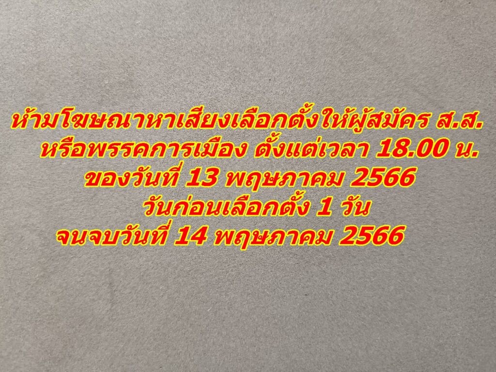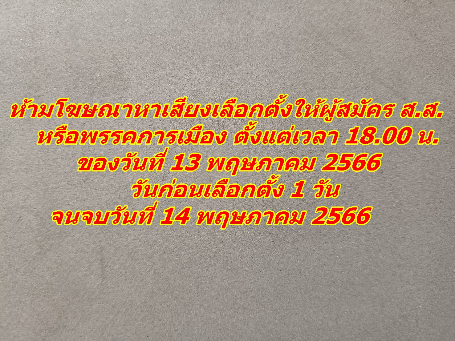 ห้ามโฆษณาหาเสียงเลือกตั้งให้ผู้สมัคร ส.ส. หรือพรรคการเมือง ตั้งแต่เวลา 18.00 น.ของวันที่ 13 พฤษภาคม 2566 (วันก่อนเลือกตั้ง 1วัน) จนจบวันที่ 14พฤษภาคม 2566