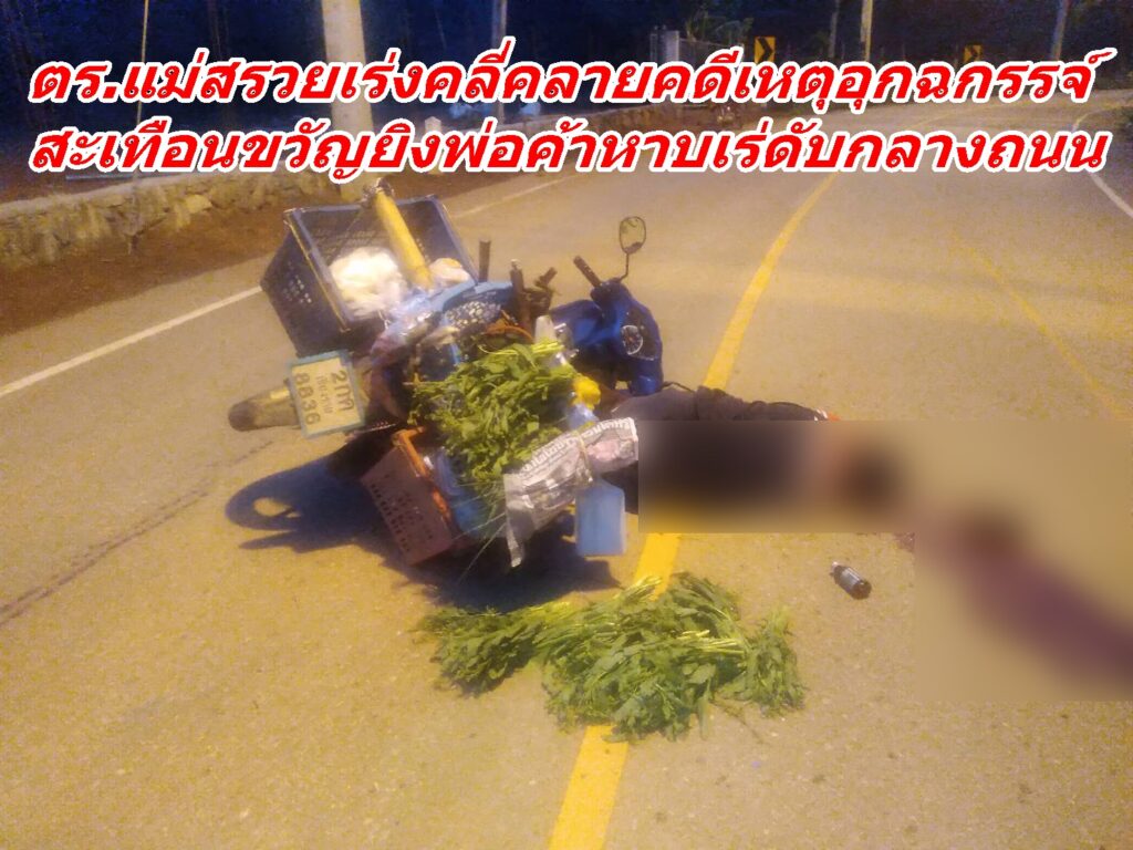 เมื่อช่วงเช้าของวันนี้ 13 พ.ค.2566 เวลา 06.00 น. เจ้าหน้าที่พนักงานวิทยุ สภ.แม่สรวย ได้รับแจ้งเหตุเบื้องต้นว่าชายขับรถประสบอุบัติเหตุเสียชีวิต จึงได้แจ้งไปยัง ร.ต.อ.ประภพ หม้อศรีชัย รอง.สารวัตรสอบสวน สภ.แม่สรวย พร้อมชุดสืบสวน ร่วมกับแพทย์ ประจำ รพ.แม่สรวย กู้ภัยแม่สรวย รุดไปตรวจสอบที่เกิดเหตุบริเวณ ถนนสายบ้านวาวี ม.1 ต.วาวี อ.แม่สรวย จ.เชียงราย เมื่อไปถึงพบร่างของ นายธฤต มาเยอะ อายุ 43 ปี อยู่ที่ 278 หมู่ 20 ต.วาวี อ.แม่สรวย จ.เชียงราย และรถจักรยานยนต์ ยี่ห้อฮอนด้า สีน้ำเงินหมายเลขทะเบียน 2กค-8836 เชียงราย ล้มอยู่กลางถนนในหมู่บ้านพร้อมกับร่างผู้เสียชีวิต หลังจากตรวจสภาพผู้ตาย พบร่องรอยการถูกยิงบริเวณด้านหลังหลายนัด จึงได้รายงานไปยัง พ.ต.อ.เกียรติศักดิ์ จิตรประสาร ผกก.สภ.แม่สรวย ให้ทราบ และแจ้งให้เจ้าหน้าที่พิสูจน์หลักฐานเชียงราย เพื่อมาตรวจวัตถุหลักฐานในที่เกิดเหตุ เบื้องต้นในคดีอุกฉกรรจ์สะเทือนขวัญ คนร้ายใช้อาวุธปืนประกบยิงพ่อค้าหาบแร่ดับกลางถนนในครั้งนี้ ทางเจ้าหน้าที่คาดว่าสาเหตุมาจากเรื่องส่วนตัวเพราะผู้ตายเป็นพูดจาโผงผางและมีประวัติเคยมีเรื่องทะเลาะเบาะแว้งกับผู้อื่นอยู่เป็นประจำ ส่วนประเด็นอื่นทางเจ้าหน้าที่ก็ยังไม่ตัดออกไป ความคืบหน้าทางทีมข่าวจะได้เกาะติดสถานการณ์คดีอาชญากรรมสะเทือนขวัญรายงานให้ทราบกันต่อไป..
