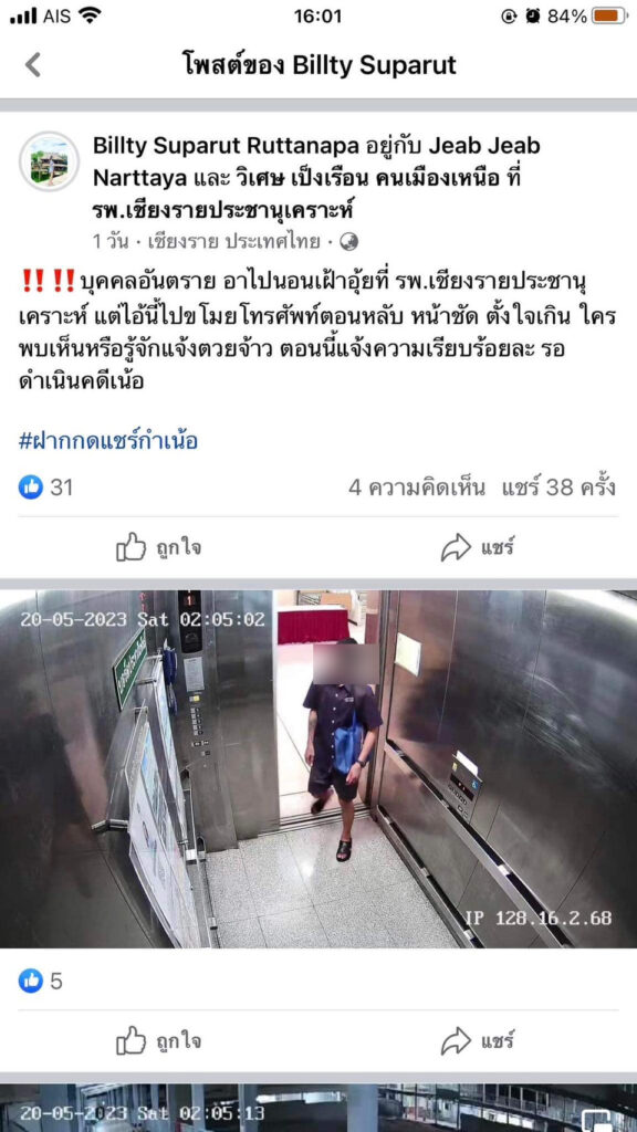 จากกรณีมีโจรลักทรัพย์โทรศัพท์มือถือญาติผู้ป่วยในโรงพยาบาลศูนย์เชียงรายประชานุเคราะห์ อ.เมือง จ.เชียงราย เมื่อกลางดึกของวันที่ 20 พ.ค.ที่ผ่านมา จากนั้นมีผู้ใช้เฟสบุ๊คชื่อ Billty Suparut Ruttanapa ได้นำภาพผู้ก่อเหตุ พร้อมกับคลิปจากกล้องวงจรปิดเป็นเหตุการณ์ขณะที่โจรแสบย่องขโมยมือถือจากญาติผู้ป่วยที่ไปนอนเฝ้าผู้ป่วยที่โรงพยาบาลมาโพสต์ พร้อมกับข้อความระบุว่า เป็นบุคคลอันตราย อาไปนอนเฝ้าอุ้ยที่ รพ.เชียงรายประชานุเคราะห์ แต่ไอ้นี้ไปขโมยโทรศัพท์ตอนอาหลับ หน้าชัด ตั้งใจเกิน ใครพบเห็นหรือรู้จักแจ้งโตยจ้าว ตอนนี้แจ้งความเรียบร้อยละ รอดำเนินคดีเน้อ #ฝากกดแชร์กำเน้อ