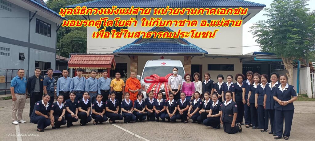 เมื่อวันที่ 17 มิ.ย.66 เวลา 09.00 น. นายณรงค์ คิดอ่าน นายอำเภอแม่สาย นางยุพิน คิดอ่าน นายกกิ่งกาชาดอำเภอแม่สาย พร้อมกิ่งกาชาดอำเภอแม่สาย ได้รับมอบรถตู้ยี่ห้อโตโยต้า รุ่น OMMTER สีรอนซ์เงิน จำนวน 1 คัน จากผู้แทนของมูลนิธิกวงเม้งแม่สาย หน่วยงานภาคเอกชนแม่สาย และ นายวิชัย ศรีพธูราษฏร์ ที่ปรึกษากิตติมศักดิ์กิ่งกาชาดอำเภอแม่สาย นางอัมพร สันชมพู ปรึกษากิตติมศักดิ์กิ่งกาชาดอำเภอแม่สาย นางพรรณี รุจิพรรณ ที่ปรึกษากิตติมศักดิ์กิ่งกาชาดอำเภอแม่สาย นางฟอง ชุ่มมงคล ที่ปรึกษากิตติมศักดิ์กิ่งกาชาดอำเภอแม่สาย นางทิพวรรณ เชื้อเจ็ดตน ที่ปรึกษากิตติมศักดิ์กิ่งกาชาดอำเภอแม่สาย เพื่อใช้ในสาธารณประโยชน์ สาธารณกุศล ในการเดินทางไปมอบสิ่งของหรือใช้ในกิจกรรมต่างๆ เพื่อช่วยเหลือประชาชนตามวัตถุประสงค์ของกิ่งกาชาดอำเภอแม่สาย และของเหล่ากาชาดจังหวัดเชียงราย