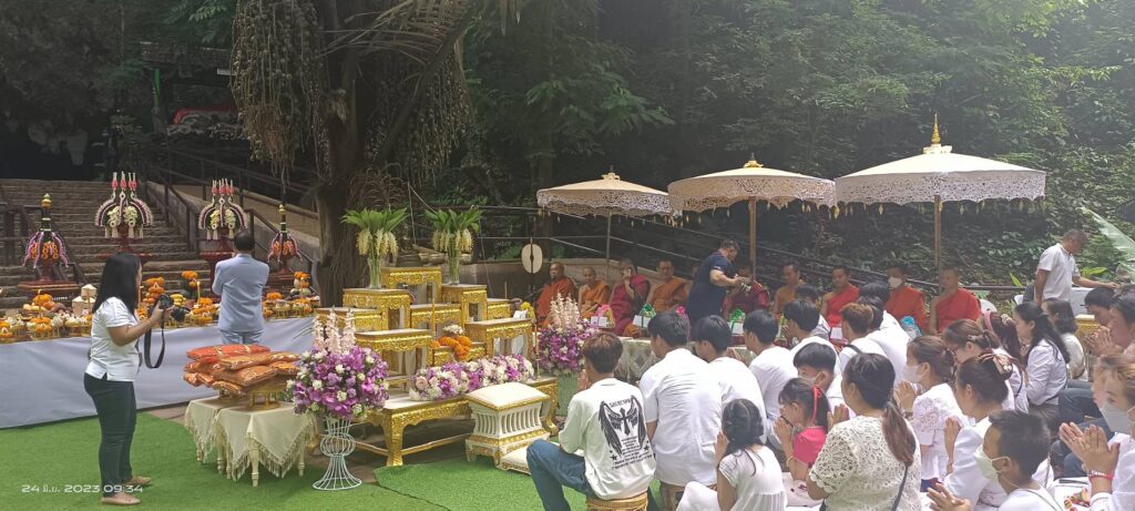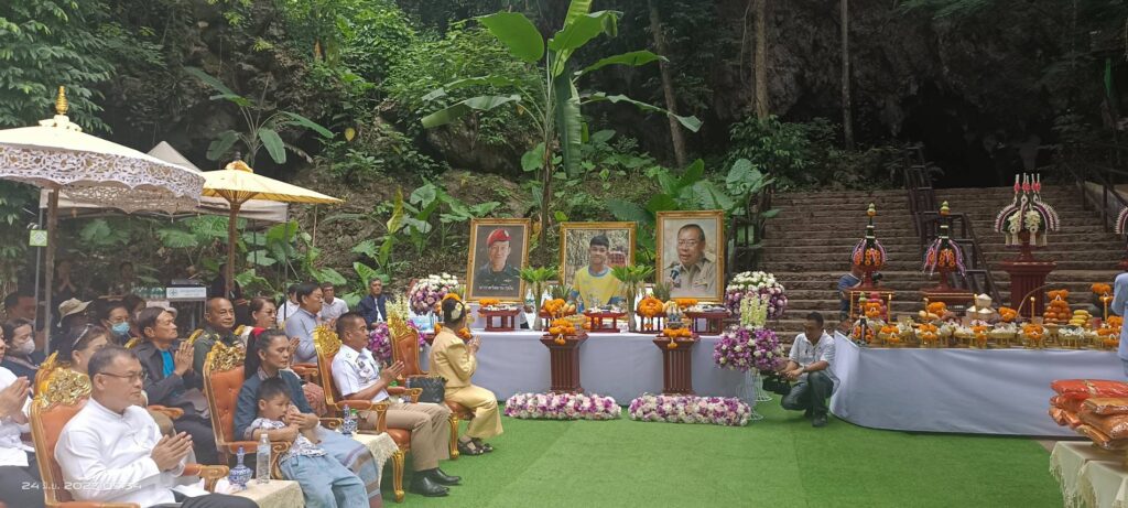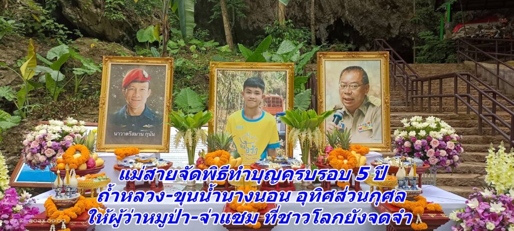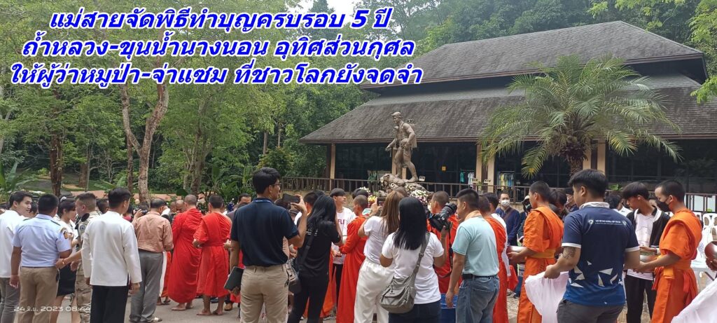 เมื่อวันที่ 24 มิ.ย.66 เวลา 08.39 น. นายณรงค์พล คิดอ่าน นายอำเภอแม่สาย พร้อมหน่วยงานภาครัฐภาคเอกชน พีน้องประชาชนชาวแม่สาย – เชียงราย ทำบุญตักบาตรพระสงฆ์ จำนวน 39 รูป หลังจากนั้นได้ทำพิธีบวงสรวงเจ้าแม่นางนอนและสิ่งศักดิ์สิทธ์ที่ปกปักรักษาถ้ำหลวง-ขุนน้ำนางนอน พร้อมทำบุญอุทิศถึงท่านผู้ว่าณรงค์ศักดิ์ โอสถธนากร (ผู้ว่าหมูป่าที่ชาวโลกยังจดจำ) และทำบุญอุทิศถึง นาวาตรีสมาน กุนัน (จ่าแซมวีรบุรุษถ้ำหลวง) เวลา 09.39 น. ผู้เข้าร่วมพิธีทำบุญครบรอบ 5 ปี ถ้ำหลวง-ขุนน้ำนางนอน ได้ประกอบพิธีทำบุญสืบชาตา โดยมีน้องๆ 13 หมู และพ่อแม่ญาติพีน้องเข้าร่วมงานบุญในครั้งนี้ ณ อุทยานแห่งชาติถ้ำหลวง-ขุนน้ำนางนอน ต.โป่งผา อ.แม่สาย จ.เชียงราย เพื่อเป็นการระลึกความสำเร็จในภารกิจเหตุการณ์กู้ภัยช่วยเหลือเด็กๆ ทีมฟุตบอลหมูป่าอะคาเดมี่ 13 ชีวิต ได้อย่างปลอดภัยเป็นข่าวโด่งดังที่ทำให้คนทั้งโลกรู้จัก ถ้ำหลวง-ขุนน้ำนางนอน เมื่อกลางปี พ.ศ. 2561 5 ปี ที่ผ่านมา…