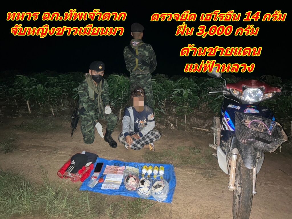 ทหาร ฉก.ทัพเจ้าตาก จับหญิงชาวเมียนมา ตรวจยึด เฮโรอีน 14 กรัม ฝิ่น 3,000 กรัม ด้านชายแดนแม่ฟ้าหลวง