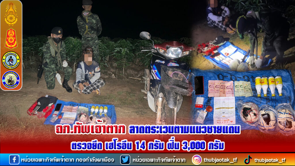 เมื่อวันที่ 1 กรกฎาคม 2566 เวลา 03.40 น. เจ้าหน้าที่ทหารชุดหน่วยเฉพาะกิจทัพเจ้าตาก กองกำลังผาเมือง โดยกองร้อยทหารม้าที่ 1 หน่วยเฉพาะกิจทัพเจ้าตาก จัดกำลังพล 1 ชุดปฏิบัติการ ทำการลาดตระเวนเพื่อป้องกันและสกัดกั้นการกระทำผิดตามพระราชบัญญัติยาเสพติด บริเวณ บ้านม้งเก้าหลัง หมู่ 9 ตำบลเทอดไทย อำเภอแม่ฟ้าหลวง จังหวัดเชียงราย ตรวจพบและจับกุมผู้กระทำผิดฯ จำนวน 1 คน (เป็นหญิง) สัญชาติเมียนมา จากการตรวจค้นรถจักรยานยนต์ ฮอนด้าเวฟ 110i สีน้ำเงิน ไม่ติดแผ่นป้ายทะเบียน พบยาเสพติดให้โทษประเภทที่ 1 (เฮโรอีน) จำนวน 14 กรัม ยาเสพติดให้โทษประเภทที่ 2 (ฝิ่น) จำนวน 3,000 กรัม เจ้าหน้าที่ทหารชุดจับกุมจึงได้นำตัวผู้ต้องหาพร้อมของกลางทั้งหมดส่ง สถานีตำรวจภูธรแม่ฟ้าหลวง เพื่อดำเนินคดีตามกฎหมายต่อไป