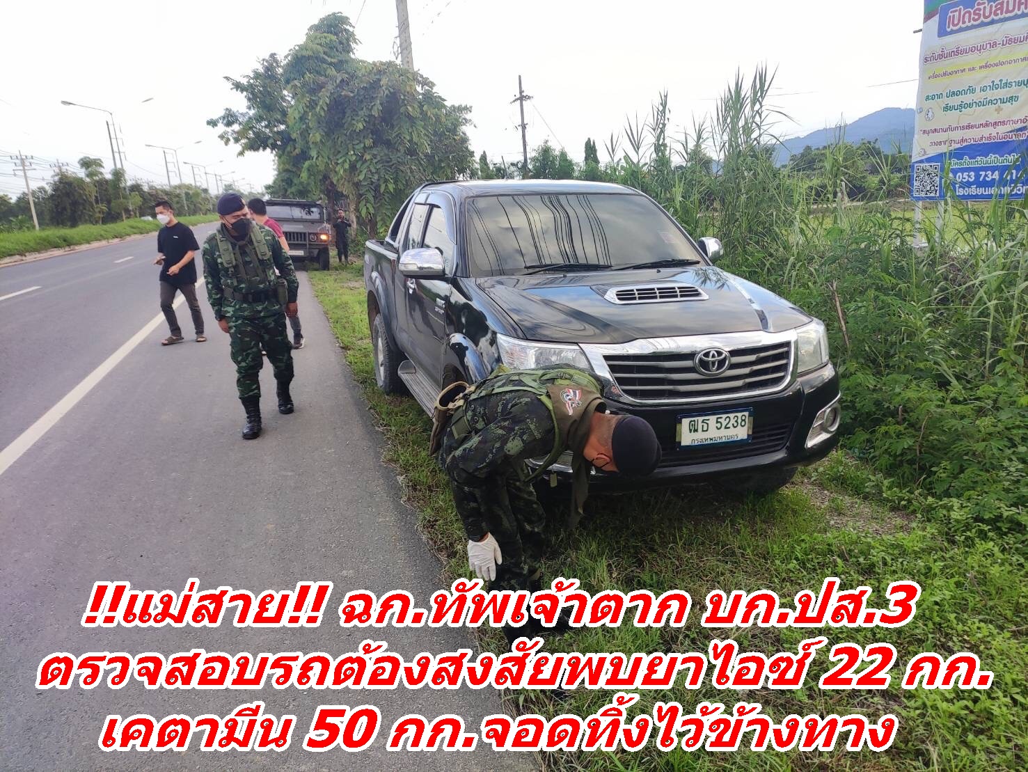 !!แม่สาย!! ฉก.ทัพเจ้าตาก บก.ปส.3 ตรวจสอบรถต้องสงสัยพบยาไอซ์ 22 กก. เคตามีน 50 กก.จอดทิ้งไว้ข้างทาง