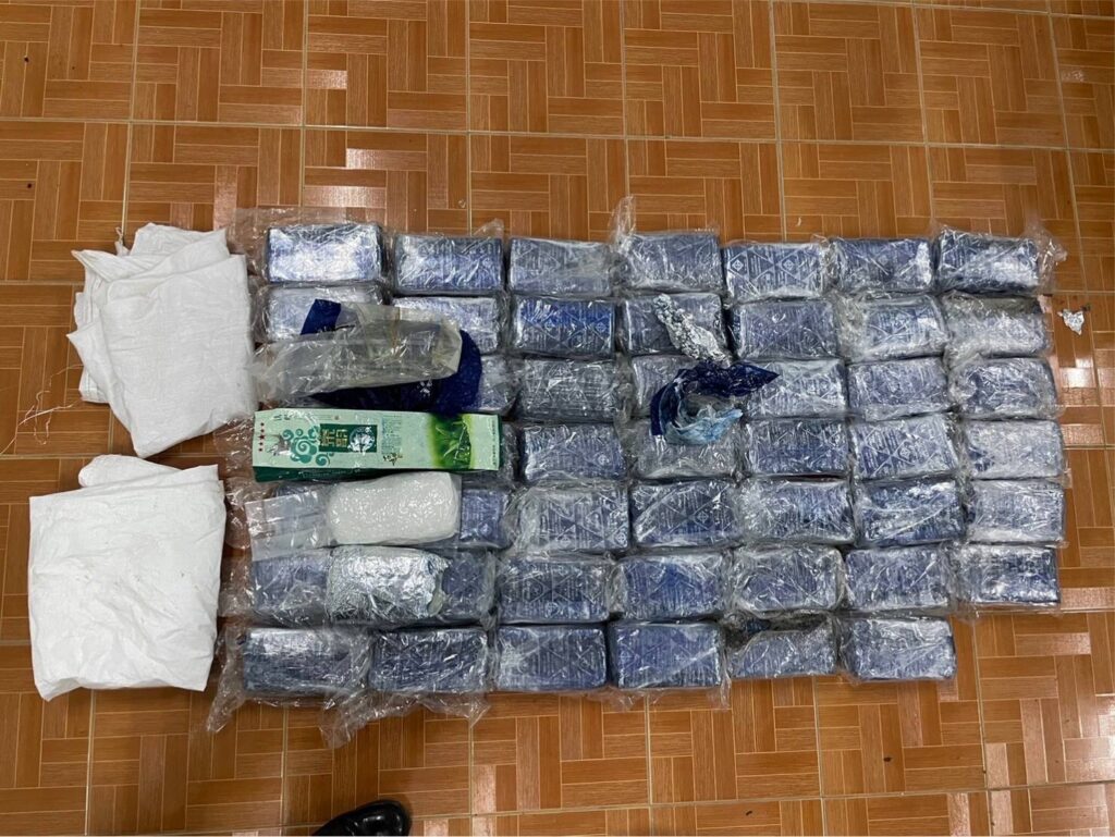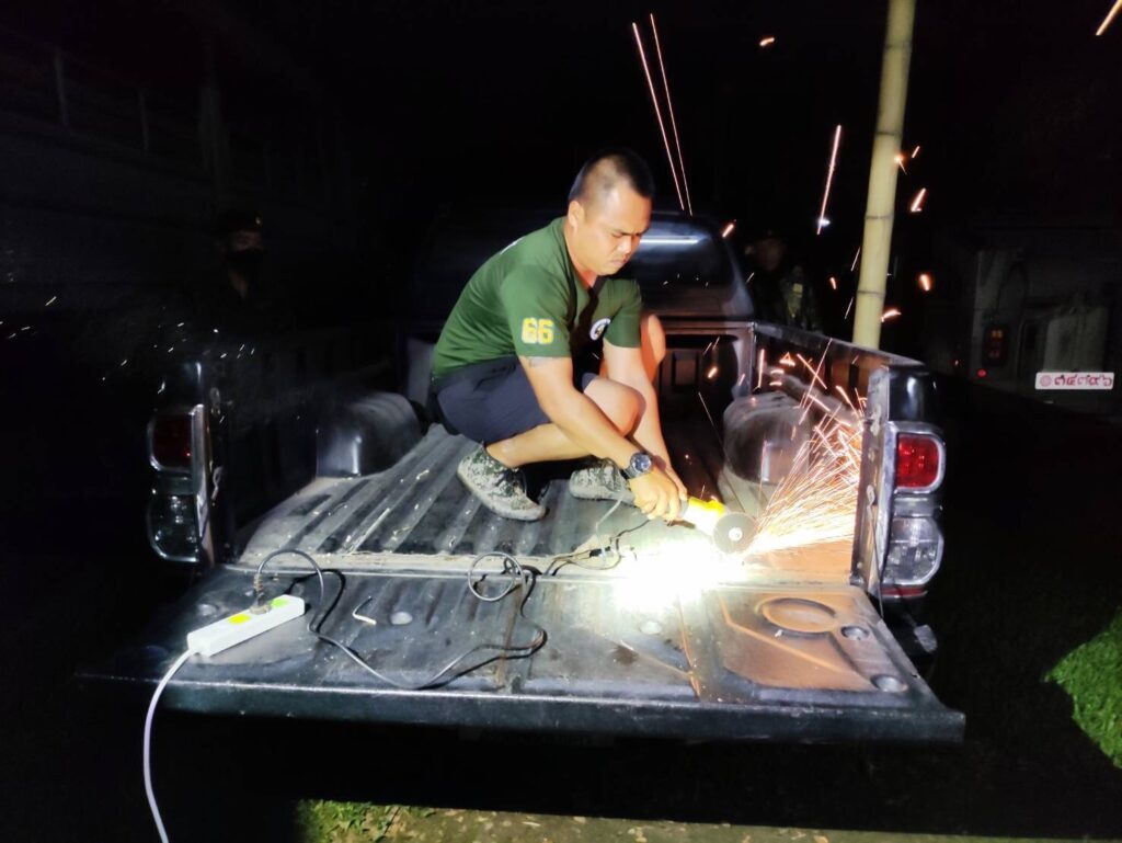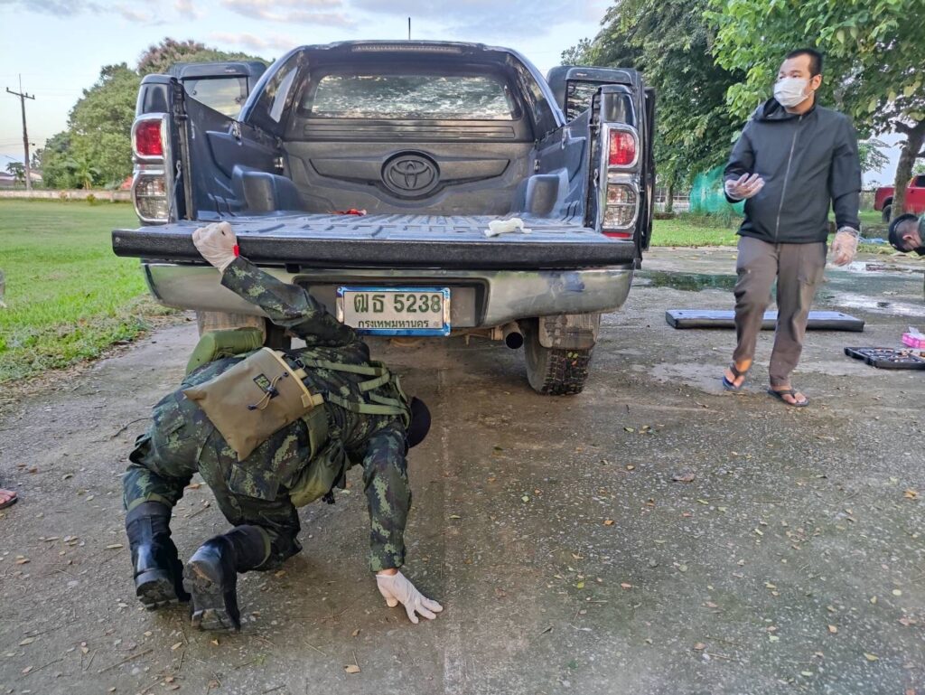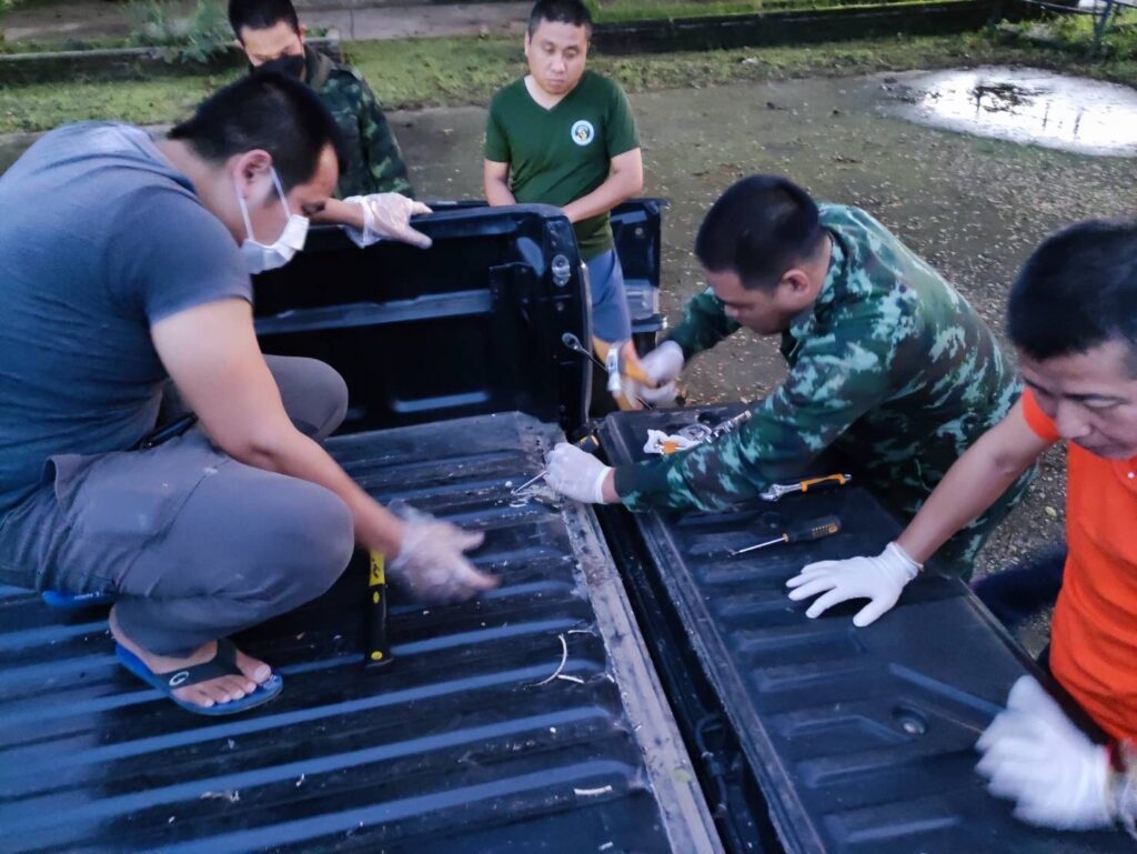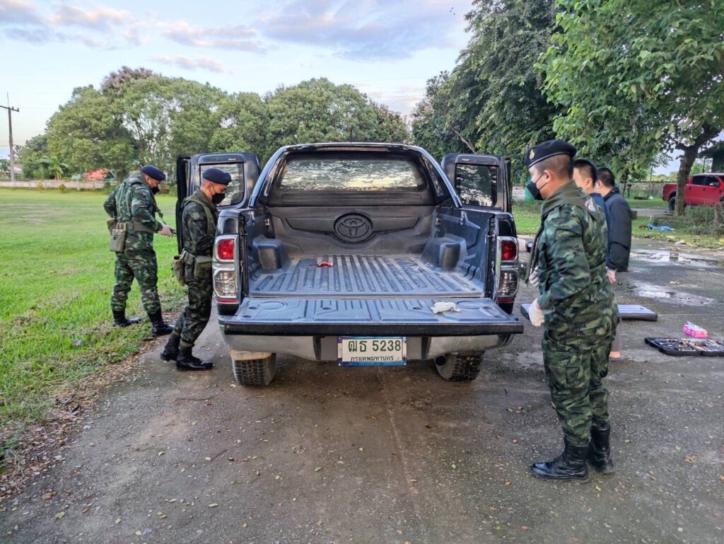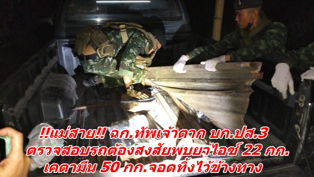 ต่อมาจนกระทั่งถึงเวลา 18.30 น. เจ้าหน้าที่ได้ตรวจพบรถยนต์กระบะยี่ห้อโตโยต้าวีโก้ สีดำหมายเลขทะเบียน ฒธ 5238 กรุงเทพมหานครต้องสงสัย จอดอยู่บริเวณ บ้านสันทรายปู่ยี่ หมู่ 4 ต.โป่งผา อ.แม่สาย จ.เชียงราย แต่ไม่พบคนขับและบุคคลที่แสดงตัวเป็นเจ้าของรถ ทางเจ้าหน้าที่จึงได้นำรถคันต้องสงสัยเคลื่อนย้านมาทำการตรวจสอบโดยละเอียดที่ บก.ผาทมิฬ ฉก.ทัพเจ้าตาก ภายหลังจากตรวจค้นอย่างละเอียดพบยาเสพติดซุกซ่อนอยู่บริเวณกระบะรถยนต์คันดังกล่าว ซึ่งได้มีการดัดแปลงเป็นช่องลับซุกซ่อนอยู่บริเวณท้ายกระบะเจ้าหน้าที่ต้อง ใช้เครื่องมือในการตรวจสอบเปิดท้ายกระบะ เมื่อเปิดออกมาพบของกลางเป็นยาเสพติดให้โทษประเภท 1 (ไอซ์) จำนวน 22 ห่อ น้ำหนักประมาณ 22 กิโลกรัม และยาเสพติดให้โทษประเภท 2 (เคตามีน) จำนวน 50 ห่อ น้ำหนักประมาณ 50 กิโลกรัม ทางเจ้าหน้าที่ชุดตรวจยึดจึงได้นำของกลางทั้งหมดส่ง สภ.แม่สาย ดำเนินคดีตามกฎหมายพร้อมจะได้ขยายผลหาอู่ซ่อมรถยนต์ที่ดัดแปลงทำช่องลับของกลุ่มขบวนการยาเสพติดในพื้นที่ อ.แม่สาย ที่ยึดได้ในครั้งนี้…