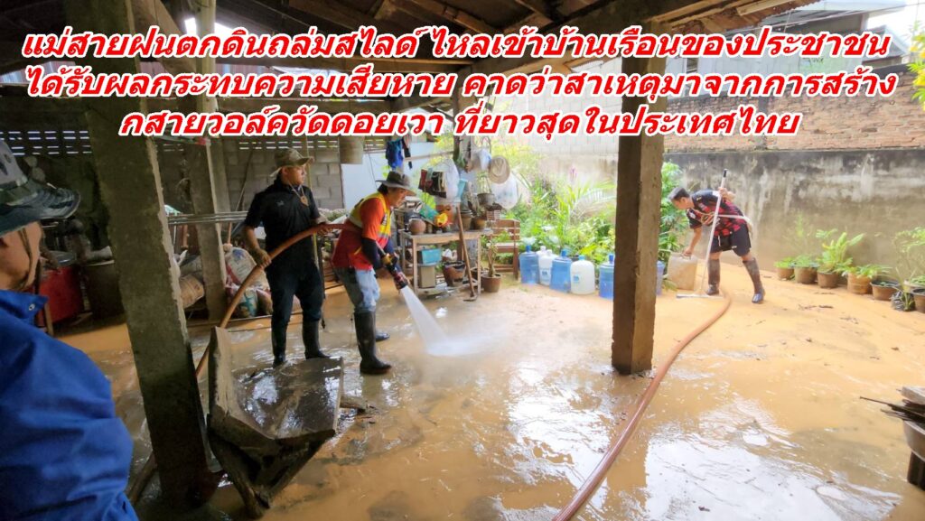 แม่สายฝนตกดินถล่มสไลด์ ไหลเข้าบ้านเรือนของประชาชนได้รับผลกระทบความเสียหาย คาดว่าสาเหตุมาจากการสร้างกสายวอล์ควัดดอยเวา ที่ยาวสุดในประเทศไทย