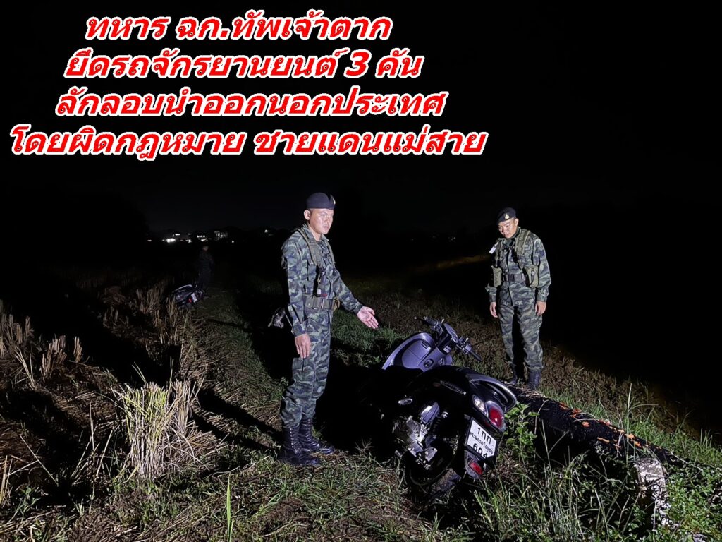ทหาร ฉก.ทัพเจ้าตาก ยึดรถจักรยานยนต์ 3 คัน ลักลอบนำออกนอกประเทศโดยผิดกฎหมาย ชายแดนแม่สาย