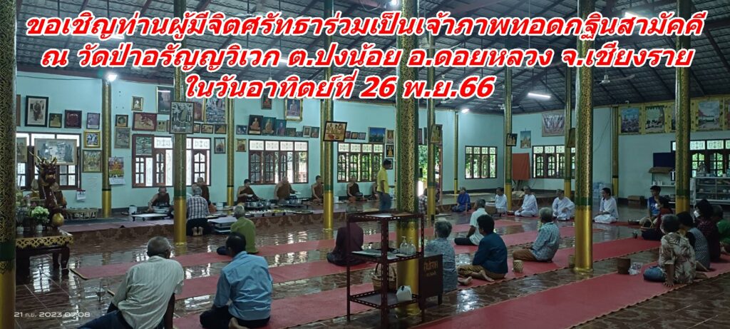 ขอเชิญท่านผู้มีจิตศรัทธาร่วมเป็นเจ้าภาพทอดกฐินสามัคคี ณ วัดป่าอรัญญวิเวก ต.ปงน้อย อ.ดอยหลวง จ.เชียงราย ในวันอาทิตย์ที่ 26 พ.ย.66
