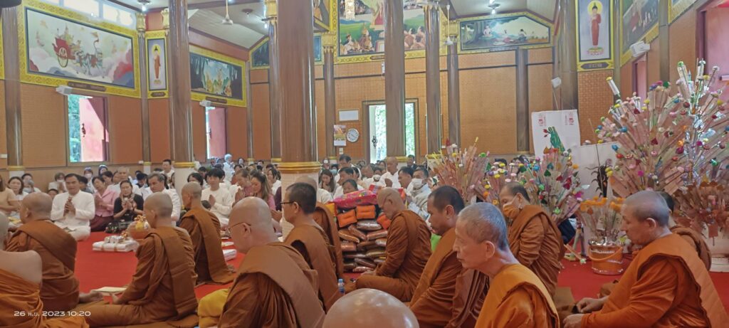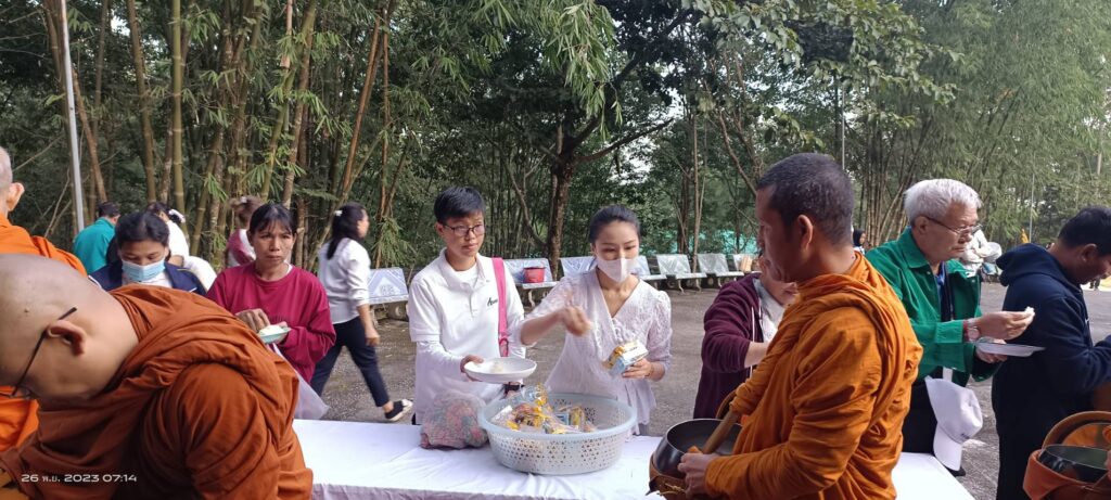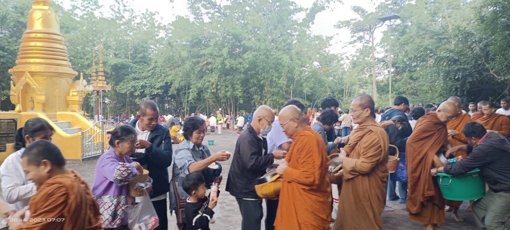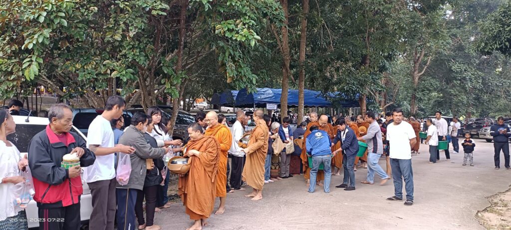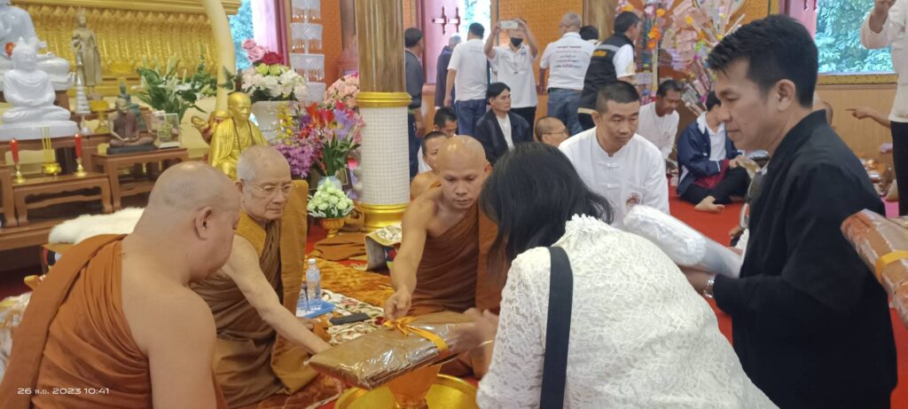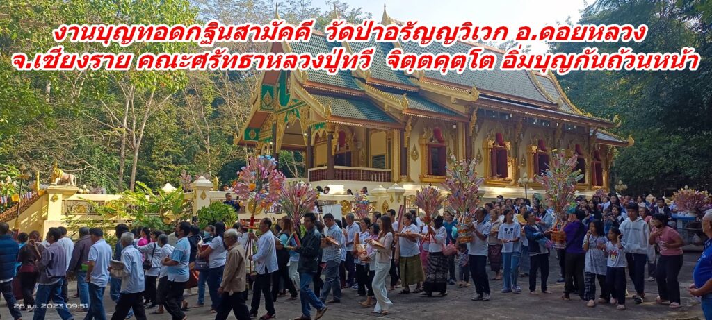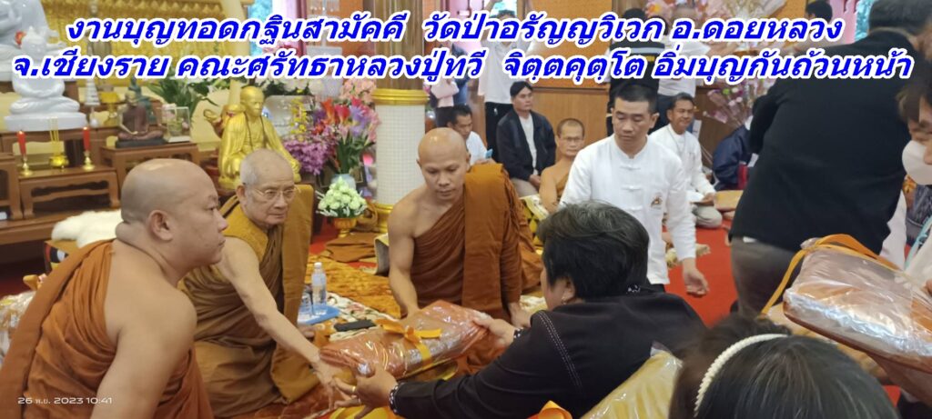 เมื่อวันอาทิตย์ ที่ 26 พ.ย.66 ขึ้น 14 ค่ำ เดือน 12 เวลา 06.30 น. คณะศรัทธาจาก อ.ดอยหลวง และใน จ.เชียงราย พร้อมคณะศรัทธาที่เดินทางมาจากต่างจังหวัด และคณะศรัทธาของ พระราชวชิราธิการ สุวิธานวนกิจจาทร ยติคณิสสร บวรสังฆาราม คามวาสี พระราชาคณะชั้นราช ฝ่ายวิปัสสนาธุระ (หลวงปู่ทวี จิตฺตคุตฺโต) ได้ร่วมกันทำบุญตักบาตรข้าวสารอาหารแห้ง ณ จุดเริ่มต้นตั้งแต่บริเวณบนพระมหาธาตุเจดีย์ 9 มงคล บ.ป่าลัน ม.5 ต.ปงน้อย อ.ดอยหลวง จ.เชียงราย เวลา 10.00 น. คณะศรัทธาตั้งขบวนกฐินแห่เข้าไปถวายยังอุโบสถวัดป่าอรัญญวิเวก โดยมี ด.ช.วิลเลียม อัสสชิระ เรวิลล์ เป็นประธานองค์กฐิน พร้อมคณะศรัทธาในจังหวัดเชียงรายและต่างจังหวัดร่วมถวายกองกฐินสามัคคีในครั้งนี้ เพื่อสมทบทุนสร้างอาคารประดิษฐาน พระพุทธวิสุทธิมงคลสยาม ( องค์หินหยก ) ซึ่งคณะศรัทธาที่เข้าร่วมงานบุญทอดกฐินสามัคคี ณ วัดป่าอรัญญวิเวกเอิบอิ่มบุญกันถ้วนหน้า…..