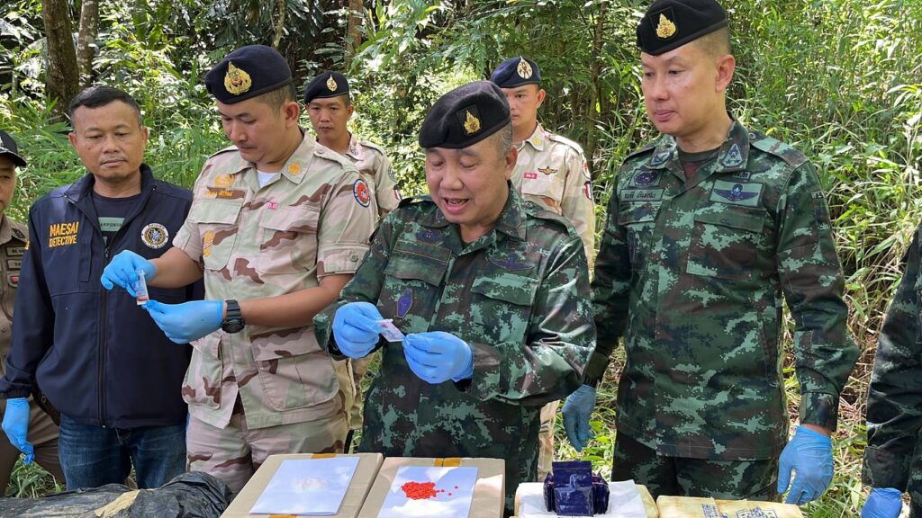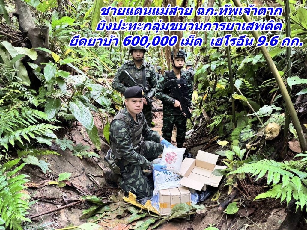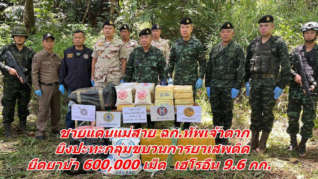 ชายแดนแม่สาย ฉก.ทัพเจ้าตาก ยิงปะทะกลุ่มขบวนการยาเสพติด ยึดยาบ้า 600,000 เม็ด เฮโรอีน 9.6 กก.