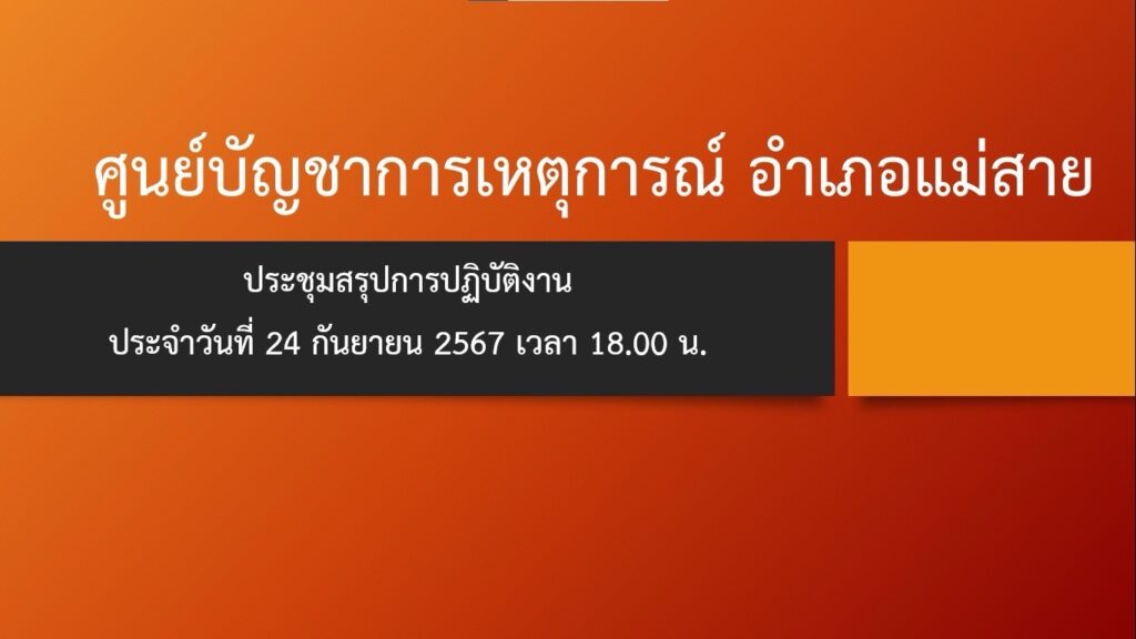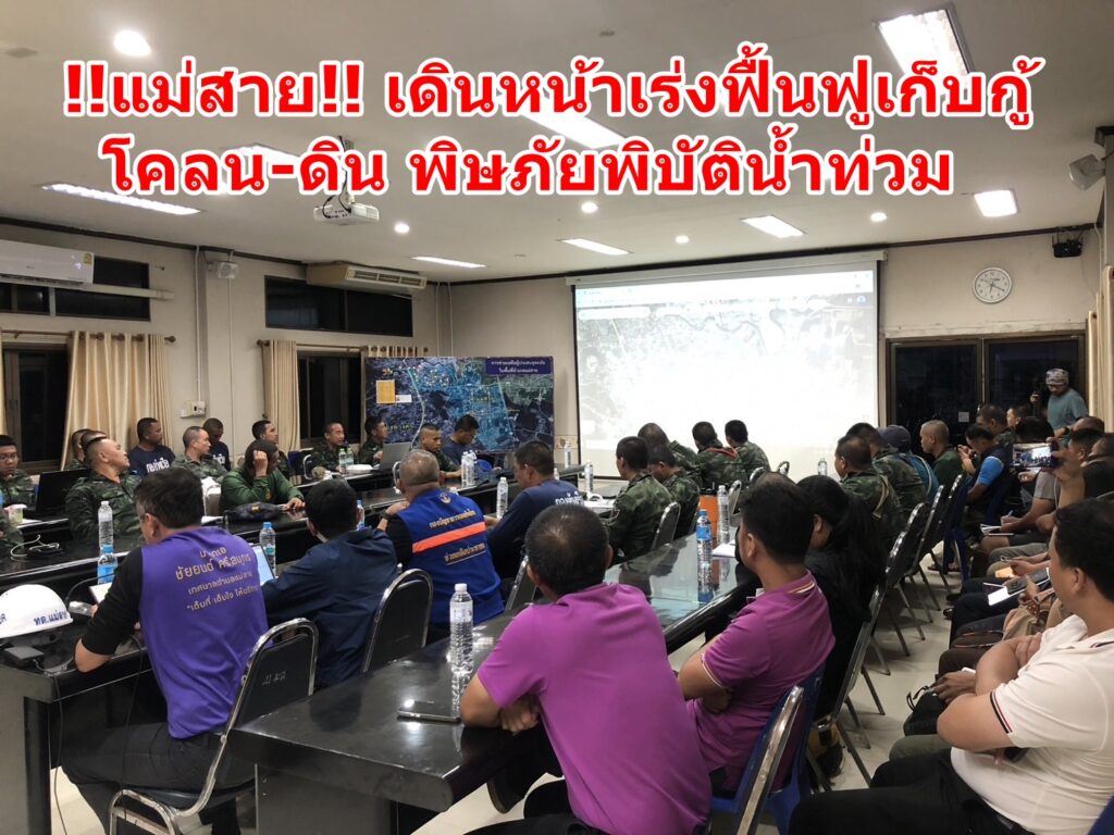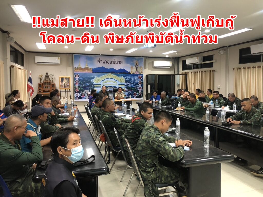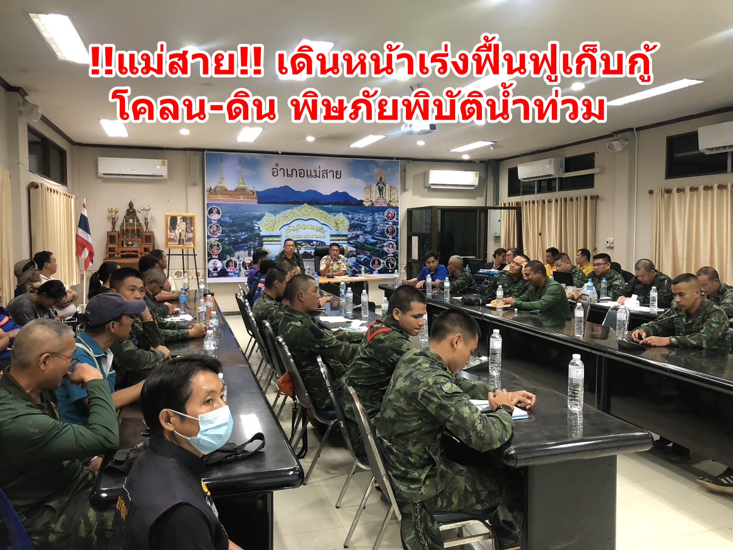 เมื่อวันที่ 24 กันยายน 2567 เวลา 18.00 น.นายณรงค์พล คิดอ่าน นายอำเภอแม่สาย พร้อมกำลังพลเจ้าหน้าที่ทหารของกองทัพไทย และหน่วยงานที่เกี่ยวข้อง ได้ประชุมติดตามสถานการณ์การสรุปผลการทำงานในรอบวันเพื่อเร่งให้ความช่วยเหลือผู้ประสบเหตุอุทกภัยในพื้นที่อำเภอแม่สาย เป็นเวลา 2 สัปดาห์ที่ผ่านมา ณ ศูนย์บัญชาการเหตุการณ์ห้องประชุมชั้น 2 ที่ว่าการอำเภอแม่สาย และมอบหมายภารกิจในการช่วยเหลือผู้ประสบภัยฯ และฟื้นฟูพื้นที่ โดยสรุปผลการประชุม ดังนี้