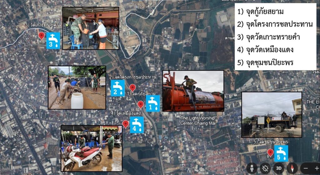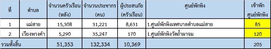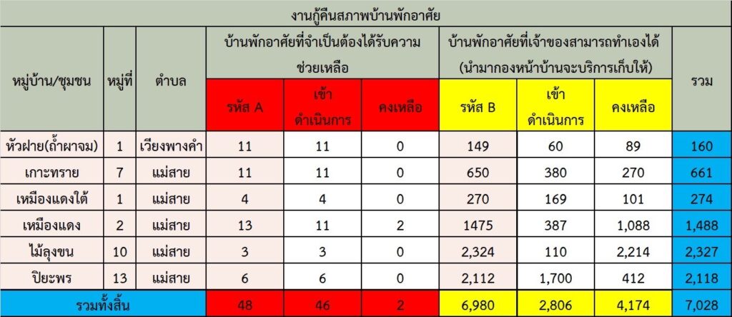 1. ศูนย์พังพิง จำนวน 2 แห่ง ได้แก่ – ศูนย์พักพิงเทศบาลตำบลแม่สาย จำนวน 85 ราย – ศูนย์พักพิงวัดถ้ำผาจม 205 ราย – รวมทั้งสิ้น 290 ราย การฟื้นฟู ได้แบ่งทีมและโซนการปฏิบัติงานกู้คืนสภาพบ้านพักอาศัย ในพื้นที่ประสบอุทกภัย โดยมีผลการดำเนินงาน ดังนี้