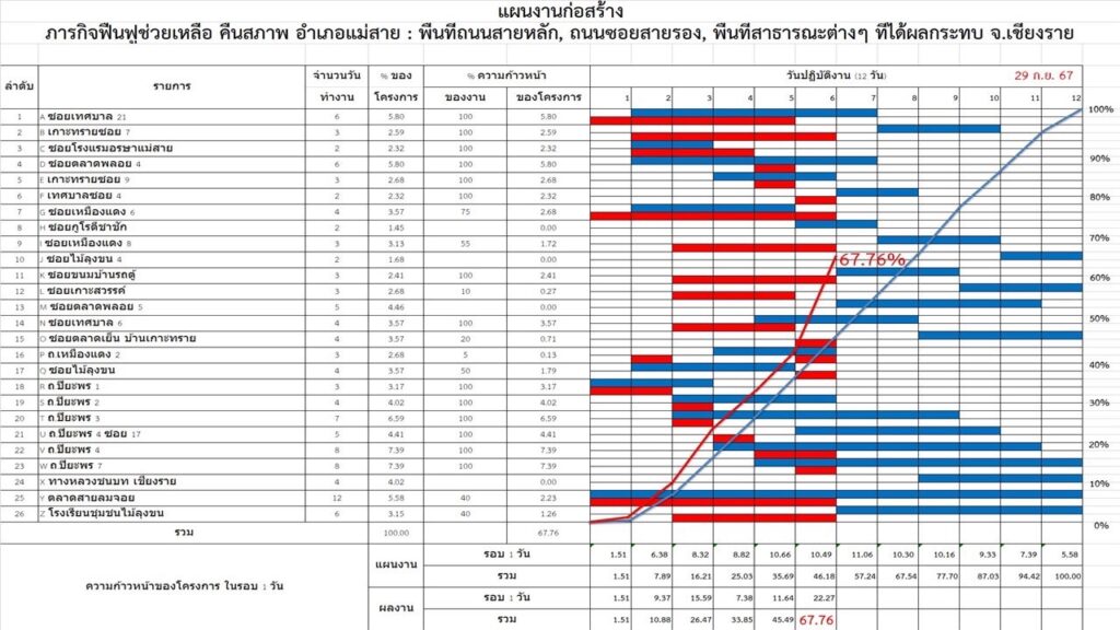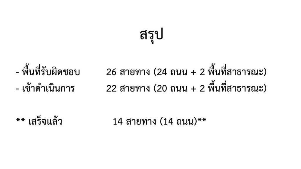 6. งานฟื้นฟูสภาพถนนและพื้นที่สาธารณะจำนวน 26 จุด 6.1 ถนน 26 สาย พื้นที่สาธารณะ 2 แห่ง เข้าดำเนินการ จำนวน 22 จุด งานถนน 24 สาย พื้นที่สาธารณะ 2 แห่ง คิดเป็นร้อยละ 67.76 ของแผนการดำเนินการ 7.แผนงานจารจร7.1 กำหนด ถนนฝั่งทิศตะวันตกให้รถประชาชนวิ่งสวนทางกันการจอดรถจอดไหล่ทางโดยอนุญาตให้จอดชิดขอบทาง7.2 กำหนดใช้เส้นทางตั้งแต่ห้วยน้ำริน – ด่านพรมแดนฯ แห่งที่1 จัดเจ้าหน้าที่อำนวยความสะดวกในการจราจรของประชาชน – การเปิด เส้นทางจะดำเนินการประสานเพื่อขอเปิดเส้นทางจราจรในบริเวณที่เครื่องจักรทำงานและการจราจรหนาแน่น