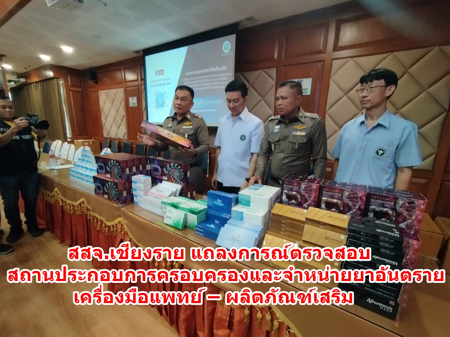 วันที่ 10 ตุลาคม 2567 เวลา 10.00 น. ที่ห้องประชุมกาสะลองคำ อาคาร 1 ชั้น 2 สำนักงานสาธารณสุขจังหวัดเชียงราย นายแพทย์วัชรพงษ์ คำหล้า นายแพทย์สาธารณสุขจังหวัดเชียงราย, ทันตแพทย์ฉลองชัย สกลวสันต์ รองนายแพทย์สาธารณสุขจังหวัดเชียงราย พล.ต.ต.มานพ เสนากูล ผู้บังคับการตำรวจภูธรจังหวัดเชียงราย, พ.ต.อ.โสภณ ม่วงเฟื่อง ผกก.สภ.เมืองเชียงราย ร่วมแถลงการตรวจสอบข้อเท็จจริง กรณีมีสถานประกอบการครอบครองและจำหน่ายยาอันตราย เครื่องมือแพทย์และผลิตภัณฑ์เสริมความงาม ที่ไม่ได้รับอนุญาต และไม่ได้รับการขึ้นทะเบียนโดยสำนักงานคณะกรรมการอาหารและยาในพื้นที่จังหวัดเชียงราย