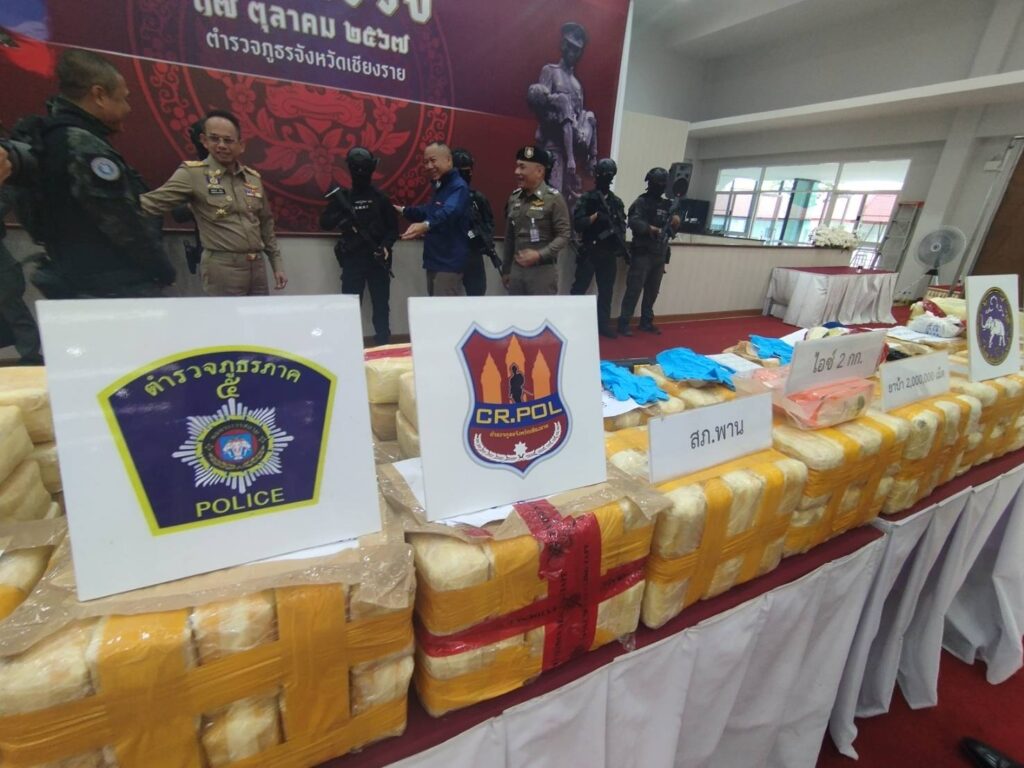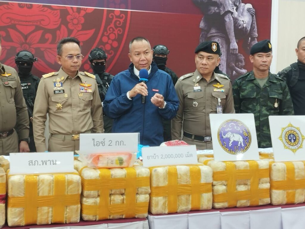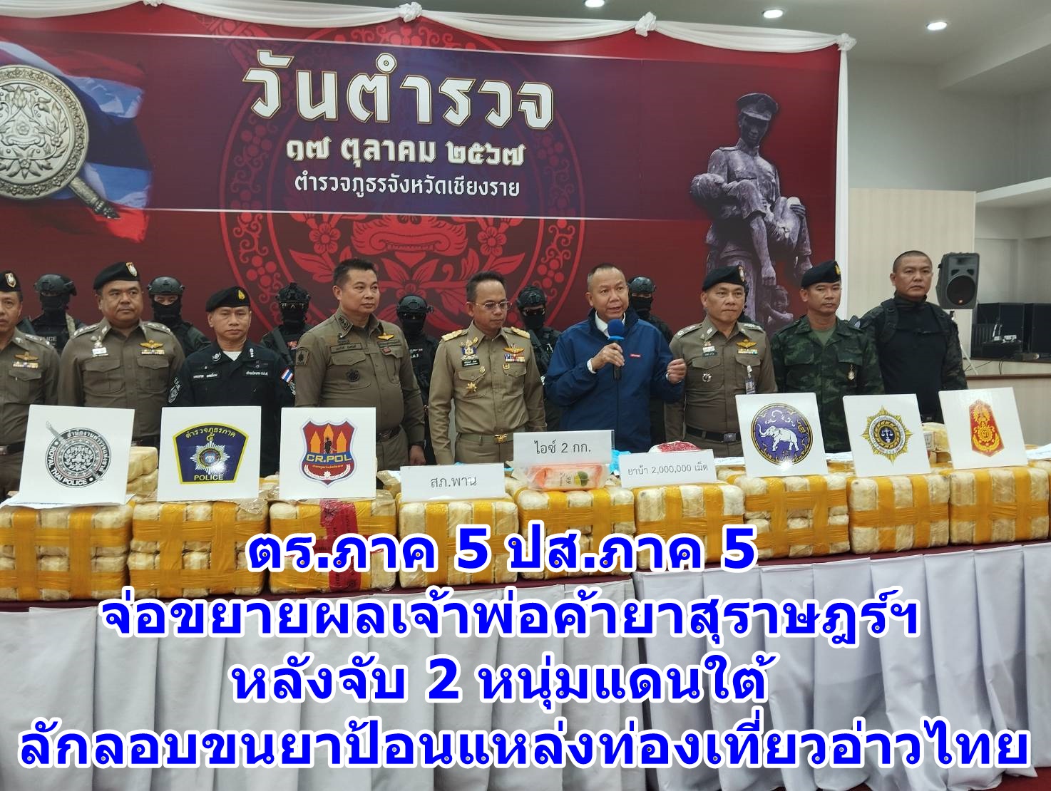 วันนี้ (17 ต.ค.) ที่ ภ.จว.เชียงราย พล.ต.ท.กฤตธาพล ยี่สาคล ผบช.ภ.5 นายโชตินรินทร์ เกิดสม รองปลัดกระทรวงมหาดไทยและรักษาราชการผู้ว่าราชการ จ.เชียงราย พล.ต.ต.มานพ เสนากุล ผบก.ภ.จว.เชียงราย พ.ต.อ.จิตรกร ปาลกะวงศ์ ณ อยุธยา ผกก.สภ.พาน จ.เชียงราย พร้อมฝ่ายปกครอง ทหารกองกำลังผาเมือง สำนักงานป้องกันยาเสพติ (ป.ป.ส.5 ) พร้อมหน่วยงานที่เกี่ยวข้อง ได้แถลงข่าวความคืบหน้ากรณีเจ้าหน้าที่ตำรวจด่านตรวจปูแกง ต.แม่เย็น อ.พาน ได้จับกุมชายชาว จ.พัทลุง จำนวน 1 คน และชาว จ.นครศรีธรรมราช จำนวน 1 คน พร้อมของกลางยาบ้าจำนวน 2,000,000 เม็ด ไอซ์น้ำหนัก 2 กิโลกรัม ขณะพากันขับรถยนต์กระบะป้ายทะเบียน จ.นครศรีธรรมราช ไปบนถนนพหลโยธินและจะผ่านด่านตรวจปูแกงดังกล่าวเหตุเกิดเช้าของวันที่ 15 ต.ค.ที่ผ่านมา