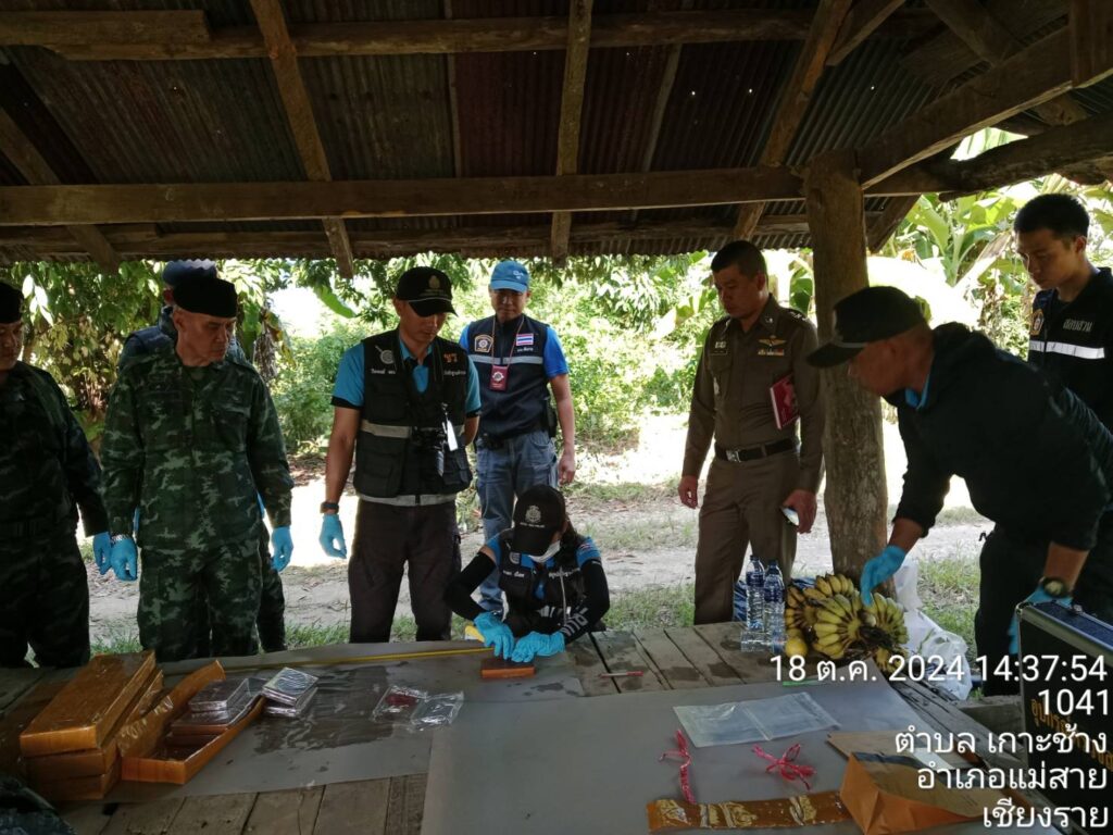 วันนี้ 18 ต.ค.67 เวลา 10.30 น. พ.ต.อ.พรเทพ ธนาบูรณศักดิ์ ผกก. สภ.เกาะช้างได้รับแจ้งจากนายณัฐพงษ์ เพิ่มพูนกิจไพศาล สารวัตรกำนัน ต.เกาะช้าง ว่ามีชาวบ้านได้พบถุงกระสอบป่านต้องสงสัยซุกซ่อนอยู่ในพงหญ้าในสวนลิ้นจี่ บริเวณหลังป่าช้าบ้านศรีป่าแดง หมู่ 9 ต.เกาะช้าง อ.แม่สาย จ.เชียงราย จึงได้สั่งการให้ พ.ต.ท.ชนาวิญ สินธุยะ รอง ผกก. สอบสวน สภ.เกาะช้าง พร้อมด้วย พ.ต.ท.พ.ต.ท.กฤตกรณ์ กันจินะ สว.สส. สภ.เกาะช้าง พ.ต.ต.พิเชษฐ์ ลาพิงค์ สวป.สภ.เกาะช้าง และเจ้าหน้าตำรวจชุดสืบสวน พร้อมเจ้าหน้าที่ทหาร ฉก.ทัพเจ้าตาก กกล.ผาเมือง เจ้าหน้าที่ปกครองอำเภอแม่สาย ตำรวจ ทหาร ปกครองแม่สาย ยึดเฮโรอีน 23 กก.