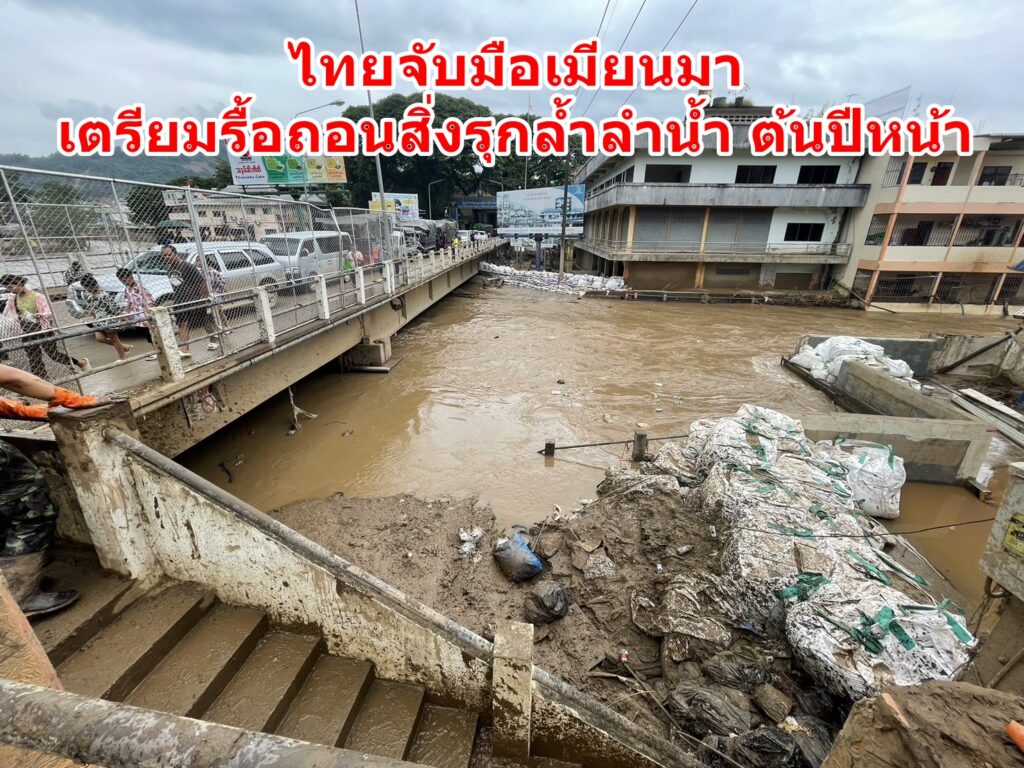 ไทยร่วมหารือเมียนมา เตรียมรื้อถอนสิ่งรุกล้ำลำน้ำ ต้นปีหน้า แก้ไขปัญหาอุทกภัยในพื้นที่ อ.แม่สาย และ จ.ท่าขี้เหล็ก อย่างยั่งยืน ในวาระการประชุมหารือ ณ ห้องประชุมด่านศุลกากรบริเวณสะพานมิตรภาพแม่น้ำสายแห่งที่ 2 ประเทศไทยและเมียนมา พลโท ณัฐพงษ์ เพราแก้ว เจ้ากรมกิจการชายแดน ร่วมประชุมหารือข้อราชการกับ พล.จ. โซหล่าย ผู้บัญชาการภาคสามเหลี่ยม เพื่อติดตามการแก้ไขปัญหาอุทกภัยในลำน้ำแม่น้ำสาย โดยมีหน่วยงานที่เกี่ยวข้องทั้งฝั่งไทยและเมียนมาเข้าร่วม