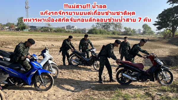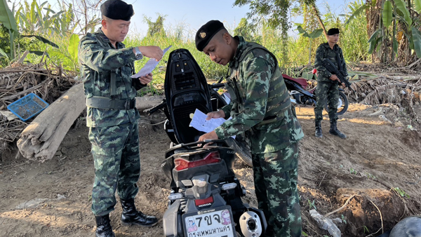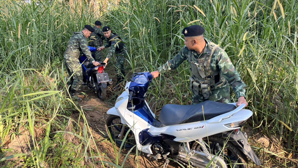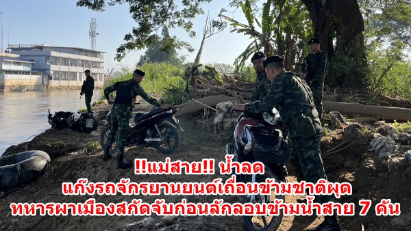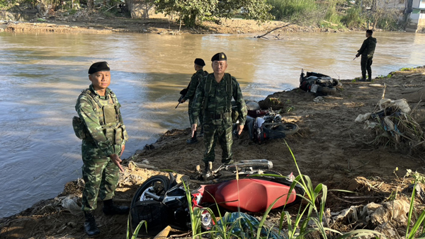 เมื่อวันที่ 3 พ.ย.ที่ผ่านมา เจ้าหน้าที่ทหาร ร้อย ม.3 ฉก.ทัพเจ้าตาก กองกำลังผาเมือง ได้นำกำลังพลออกลาดตระเวนตามแนวชายแดนไทย-เมียนมา ด้านหมู่บ้านสันผักฮี้ หมู่ 3 ต.แม่สาย อ.แม่สาย จ.เชียงราย บริเวณใกล้ๆ กับสะพานข้ามลำน้ำสายแห่งที่ 2 ซึ่งช่วงนี้ระดับน้ำได้ลดลงสู่ภาวะปกติแล้วหลังน้ำท่วมใหญ่เมื่อเดือน ก.ย.2567 ที่ผานมา ปรากฎว่าเมื่อเจ้าหน้าที่ออกตรวจลาดตระเวนไปถึงริมฝั่งที่่มีป่าละเมาะอยู่ได้พบกลุ่มคนจำนวนประมาณ 12-15 คน กำลังพากันจูงลำเลียงรถจักรยานยนต์หลายคันอยู่ในฝั่งไทยและกำลังไปยังริมฝั่งลำน้ำสายซึ่งเป็นเขตเส้นทางยุทธศาสตร์แนวชายแดนในการจะลักลอบส่งออกไปยังประเทศเมียนมา