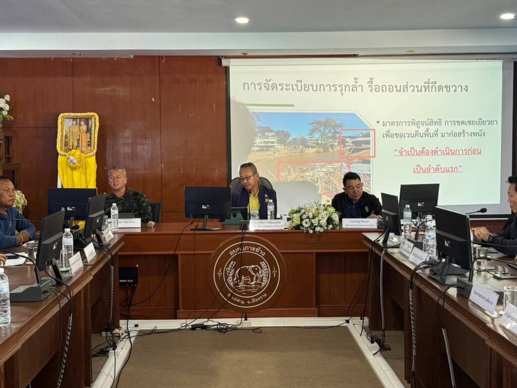 เมื่อวันอาทิตย์ที่ 17 พ.ย.67 ที่ผ่านมา เวลา 10.40 น. ดร.สุรสีห์ กิตติมณฑล เลขาธิการสำนักงานทรัพยากรน้ำแห่งชาติ เป็นประธานการประชุม นายศรัณยู มีทองคำ ผู้ตรวจราชการกระทรวงมหาดไทย พร้อมคณะฯ และนายประสงค์ หล้าอ่อน รองผู้ว่าราชการจังหวัดเชียงราย นายสิทธิศักดิ์ อินใจคำ ปลัดอำเภอหัวหน้ากลุ่มงานบริหารงานปกครอง รักษาราชการแทนนายอำเภอแม่สาย เจ้าหน้าที่หน่วยงานชายแดนที่เกี่ยวข้องได้เข้าร่วมประชุม เพื่อเตรียมความพร้อมในการสำรวจพื้นที่แม่น้ำสาย ชายแดนไทย-เมียนมา ณ องค์การบริหารส่วน ตำบลเกาะช้าง อำเภอแม่สาย จังหวัดเชียงราย โดยมีฝ่ายทหาร ,ฝ่ายปกครองจังหวัดเชียงราย – ปกครอง อ.แม่สาย ,กรมแผนที่ทหาร,กรมชลประทาน,องค์กรปกครองส่วนท้องถิ่น ร่วมประชุมกันกว่า 50 คน