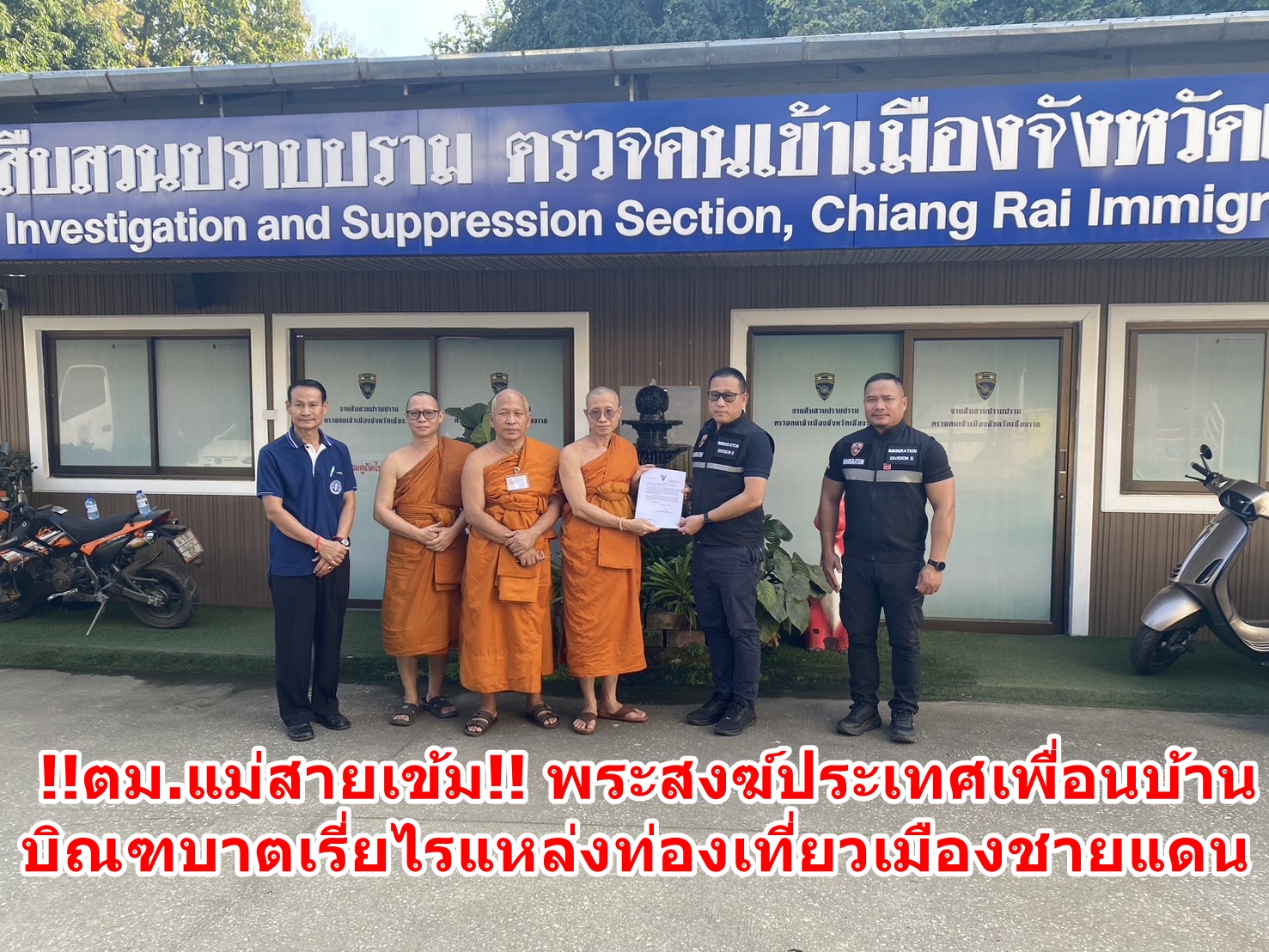 สืบเนื่องจากกรณี เมื่อวันที่ 20 พ.ย.67 ที่ผ่านมา เจ้าหน้าที่ฝ่ายสืบสวน ตม.จว.เชียงราย พร้อม คณะพระวินยาธิการ อ.แม่สาย จ.เชียงราย ได้ร่วมกันหารือกรณีพระสงฆ์จากประเทศเพื่อนบ้านมาเดินบิณฑบาตที่ตัวเมืองแม่สายแล้วเดินเรี่ยไรเงินทำบุญจากพี่น้องประชาชนในพื้นที่ อ.แม่สาย จ.เชียงราย โดยใช้กิริยาวาจา ไม่สุภาพ กอปร.กับ สำนักงานพระพุทธศาสนา จ.เชียงราย ได้มีหนังสือขอความร่วมมือในการสอดส่องดูแลและกวดขันพระภิกษุ และสามเณรในการบิณฑบาตเรี่ยไร โดยให้เป็นไปในประการที่เอื้อต่อพระธรรมวินัย กฎหมาย กฎ ระเบียบ คำสั่ง มติมหาเถรสมาคม จากการได้รับเรื่องร้องเรียนในพื้นที่ อ.แม่สาย จ.เชียงราย
