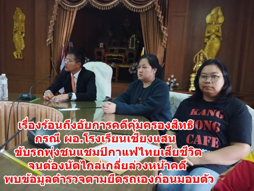 เรื่องร้อนถึงอัยการคดีคุ้มครองสิทธิ ผอ.โรงเรียนเชียงแสน ขับรถพุ่งชนแชมป์กาแฟไทยดับ จนต้องนัดไกล่เกลี่ยล่วงหน้าคดี พบข้อมูลตำรวจตามยึดรถเองก่อนมอบตัว