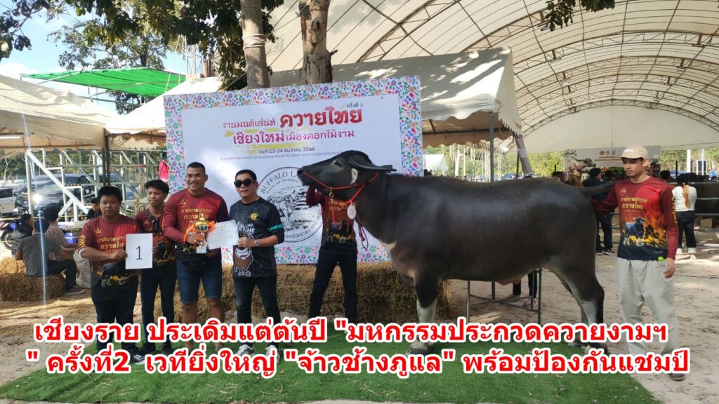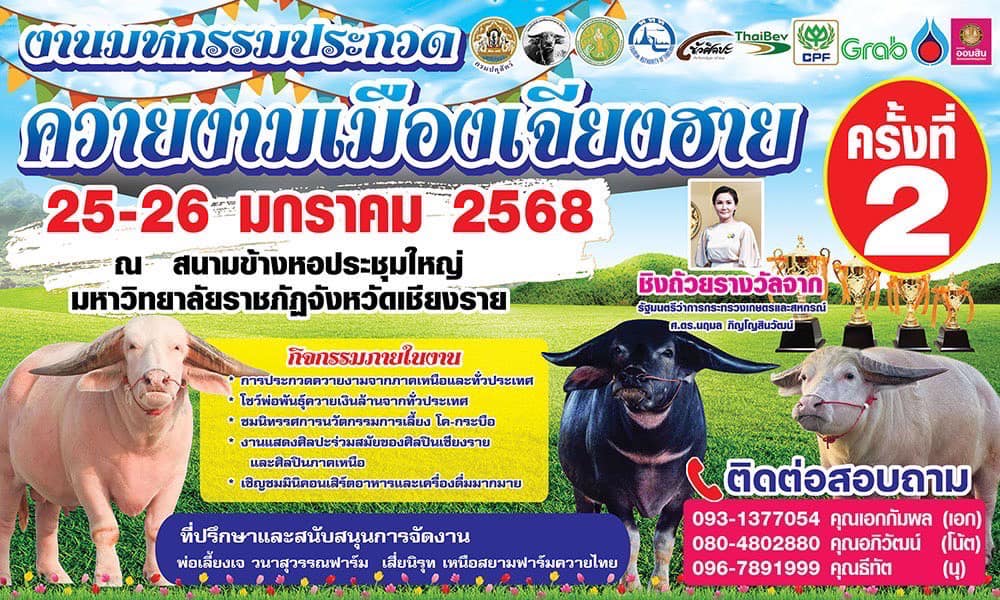 ระหว่างวันที่ 25-26 ม.ค.2568 กรมปศุสัตว์ร่วมกับสมาคมอนุรักษ์และพัฒนาควายไทย ชมรมอนุรักษ์และพัฒนาควายงาม จ.เชียงราย และหน่วยงานที่เกี่ยวข้อง โดยมีพ่อเลี้ยงเจ วนาสุวรรณฟาร์ม และเสี่ยนิรุท เหนือสยามฟาร์มควายไทย เป็นที่ปรึกษาและสนับสนุน ได้เตรียมการจัดงาน “มหกรรมประกวดควายงามเมืองเจียงฮาย ครั้งที่ 2” ณ สนามข้างหอประชุมใหญ มหาวิทยาลัยราชภัฏเชียงราย ต.บ้านดู่ เมืองเชียงราย จ.เชียงราย หลังจากที่ประสบความสำเร็จในการจัดครั้งที่ 1 ณ สนามหาดทรายเทียมหนองหลวง อ.เวียงชัย จ.เชียงราย เมื่อปลายปี 2566 มาแล้ว โดยครั้งนั้นมีควายชื่อดังหลายตัวไปแสดงตัวและขายน้ำเชื้อ เช่น เพชรภูแพง,ช้างอุดร ฯลฯ ที่มีมูลค่าตัวละกว่า 15 ล้านบาท