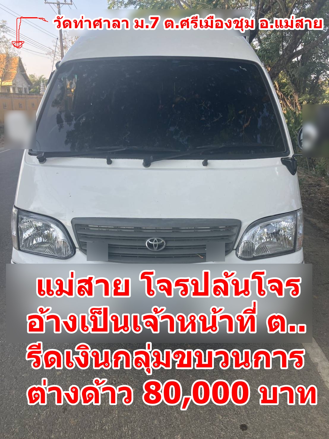 เมื่อช่วงกลางของวันที่ 13 ม.ค.68 ที่ผ่านมา ได้มีกลุ่มคนอ้างเป็นเจ้าหน้าที่ ต.. หน่วยงานหนึ่งใน อ.แม่สาย จ.เชียงราย ขับรถปาดหน้าสกัดจับรถขนแรงงานต่างด้าว แล้วรีดเงินเป็นจำนวน 80,000 บาท บริเวณหน้าวัดท่าศาลา ม.7 ต.ศรีเมืองชุม อ.แม่สาย เขตพื้นที่ของ สภ.เกาะช้าง