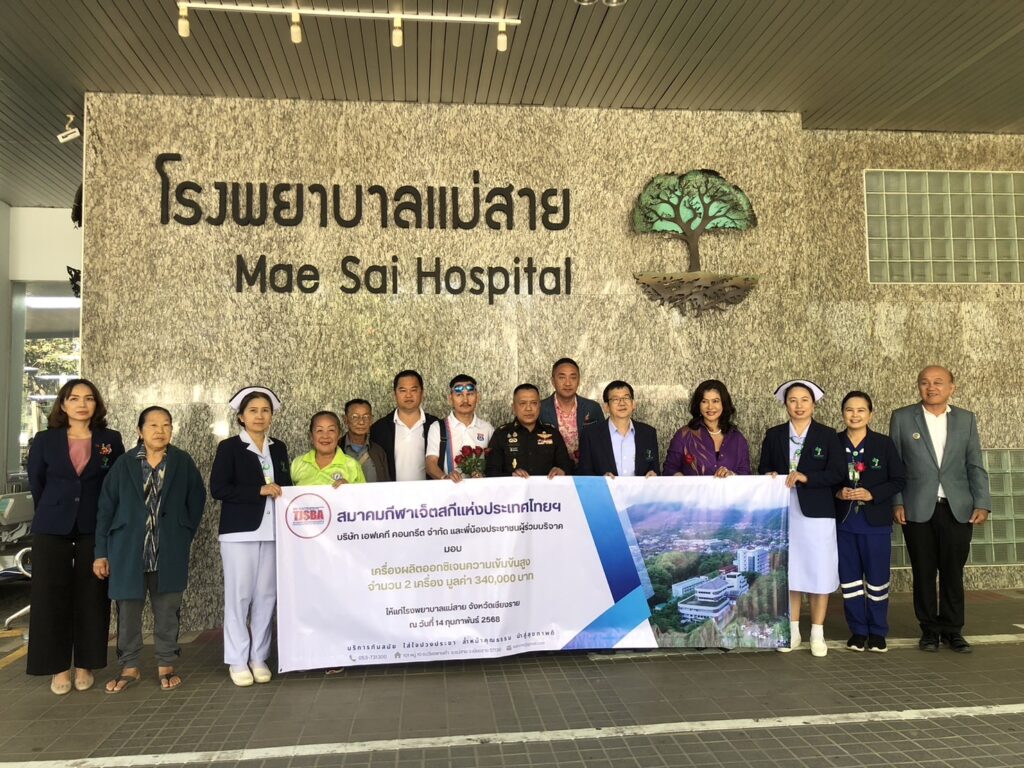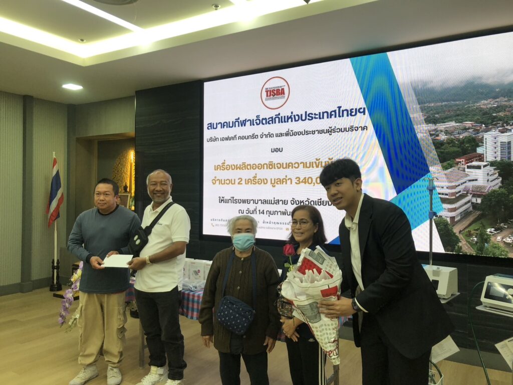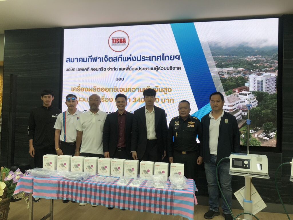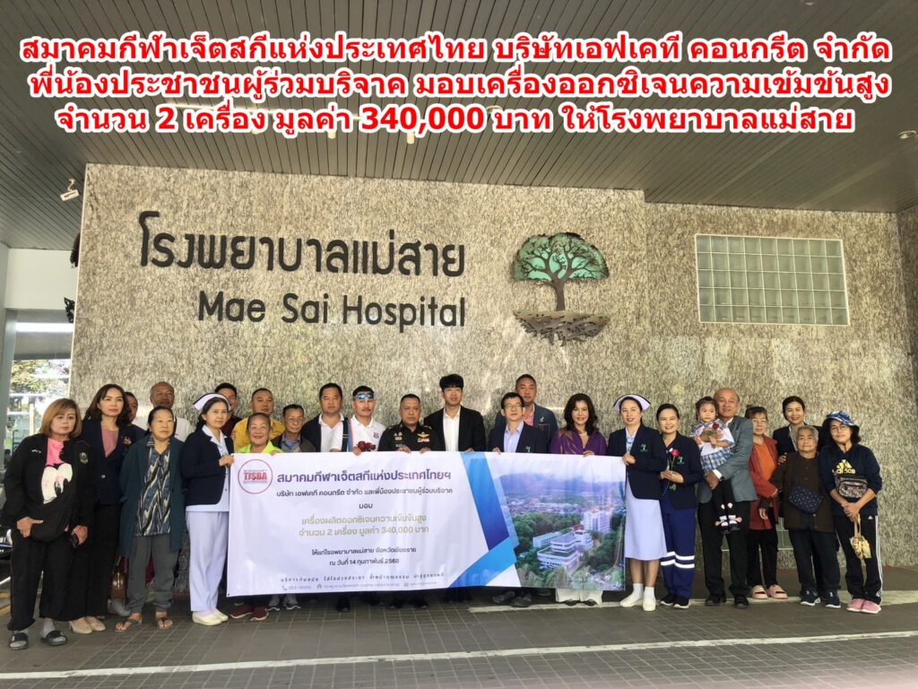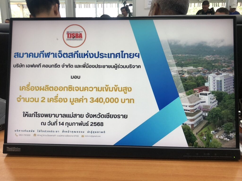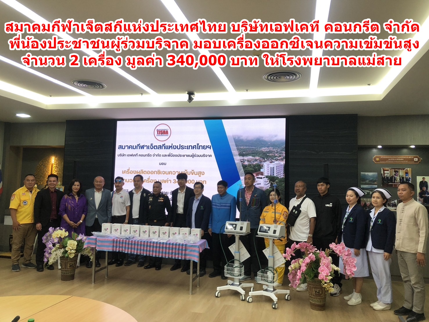 สมาคมกีฬาเจ็ตสกีแห่งประเทศไทย บริษัท เอฟเคที คอนกรีต จำกัด พี่น้องประชาชนผู้ร่วมบริจาค มอบเครื่องออกซิเจนความเข้มข้นสูง จำนวน 2 เครื่อง มูลค่า 340,000 บาท ให้โรงพยาบาลแม่สาย