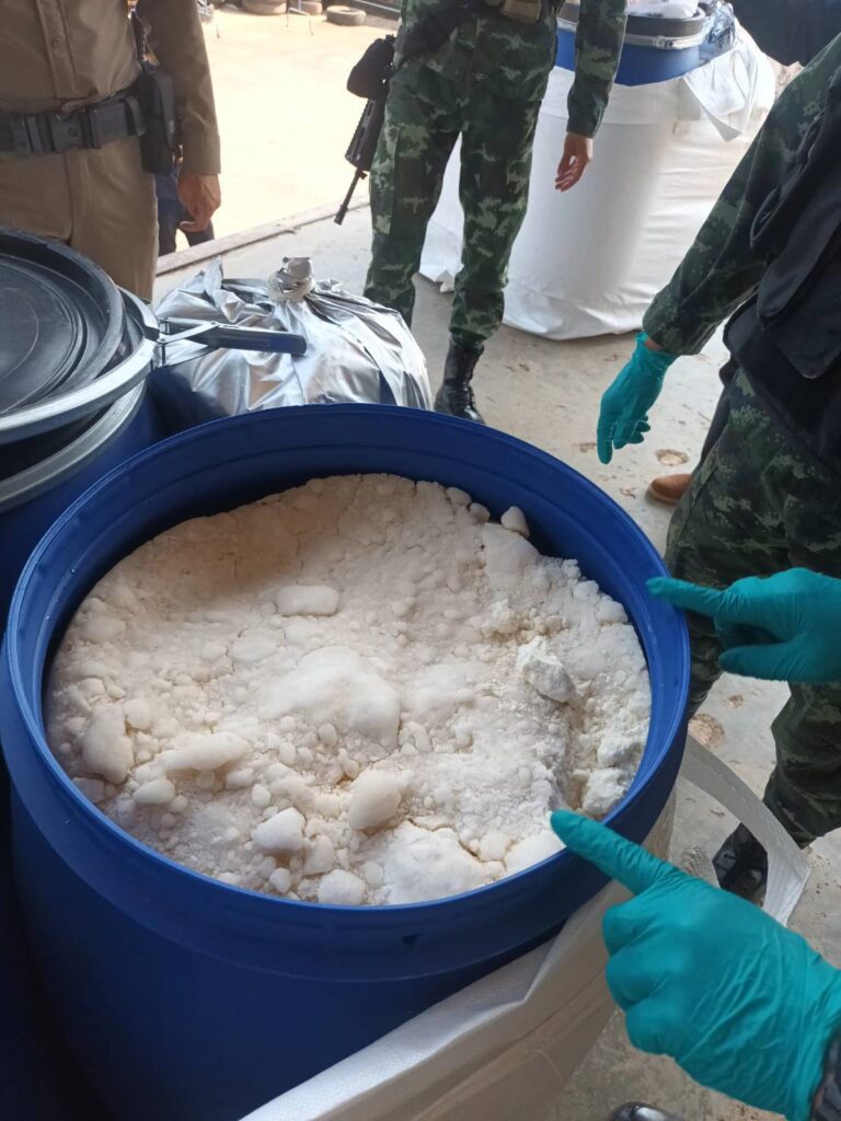 หลังจากได้รับแจ้งจากผู้ดูแลโกดังดังกล่าวว่าได้มีเอกชนชาวจีนฝากส่งวัตถุต้องสงสัยบรรจุในถุงกระสอบสีขาวขนาดใหญ่ 2 ใบ อ้างว่าเป็นเครื่องจักรจะนำไปส่งที่โรงโม่หินแห่งหนึ่งในรัฐฉาน ประเทศเมียนมา แต่ดูแล้วมีลักณะต้องสงสัยเกรงว่าไม่ตรงกับที่แจ้งทางโกดังเอาไว้ จึงได้แจ้งเจ้าหน้าที่ไปตรวจสอบดังกล่าว ผลการตรวจไม่พบเป็นเครื่องจักรแต่ในถุงเป็นถังสีน้ำเงินถุงละ 3 ถัง รวมเป็น 6 ถัง แต่ละถังบรรจุผงสีขาวมีสีขุ่นและมีกลิ่นฉุน ซึ่งไม่ตรงกับที่แจ้งส่งออกจริง