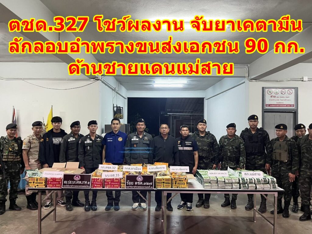 ตชด.327 โชว์ผลงาน จับยาเคตามีน ลักลอบอำพรางขนส่งเอกชน 90 กก. ด้านชายแดนแม่สาย