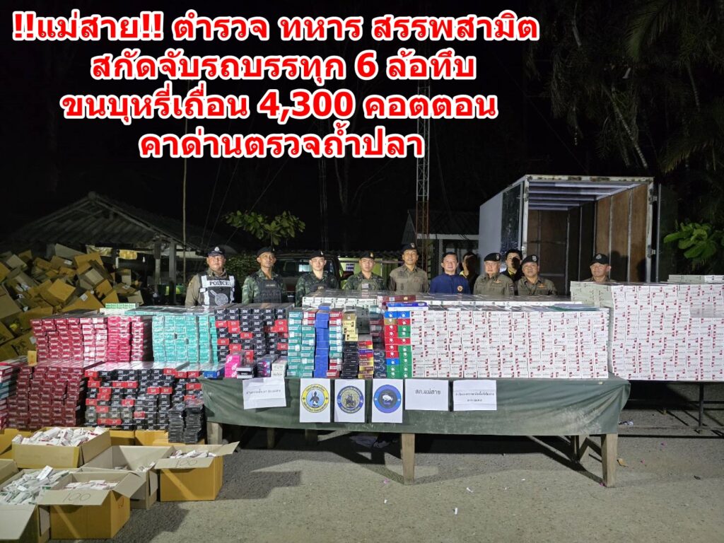 ขณะทางเจ้าหน้าที่ปฏิบัติงานเพื่อป้องกันและสกัดกั้นการกระทำผิดตามกฎหมายตาม ณ บริเวณจุดตรวจสกัดกั้นบ้านถ้ำปลา ต.โป่งงาม อ.แม่สาย จ.เชียงราย พบรถบรรทุก 6 ล้อทึบ ยี่ห้อ CANTER สีขาว ทะเบียน เชียงราย ต้องสงสัยมีพิรุธตามที่แหล่งข่าวรายงาน จึงขออนุญาตทำการตรวจค้น หลังจากการตรวจค้นภายในรถอย่างละเอียด พบบุหรี่ผิดกฎหมาย รวมจำนวน 4,328 คอตตอน แบ่งเป็น 17 ยี่ห้อ เช่น ATLANTA, ASIA STAR, THE KING, BLACK FOX และ ATLANTA PREMIUM เจ้าหน้าที่ชุดจับกุมได้ควบคุมตัวคนขับรถ 6 ล้อทึบ คันดังกล่าว เป็นชาย อายุ 36 ปี ชาวอำเภอแม่จัน จังหวัดเชียงราย พร้อมของกลาง และแจ้งข้อกล่าวหากระทำผิดตาม พ.ร.บ.ศุลกากร พ.ร.บ.สรรพสามิต จึงได้นำตัวให้ผู้ต้องหาพร้อมของกลาง ส่งพนักงานสอบสวน สภ.แม่สาย ดำเนินคดีตามกฎหมาย ส่วนของกลางถูกส่งต่อให้เจ้าหน้าที่สรรพสามิต อ.แม่สาย ตรวจยึดตรวจสอบต่อไป…