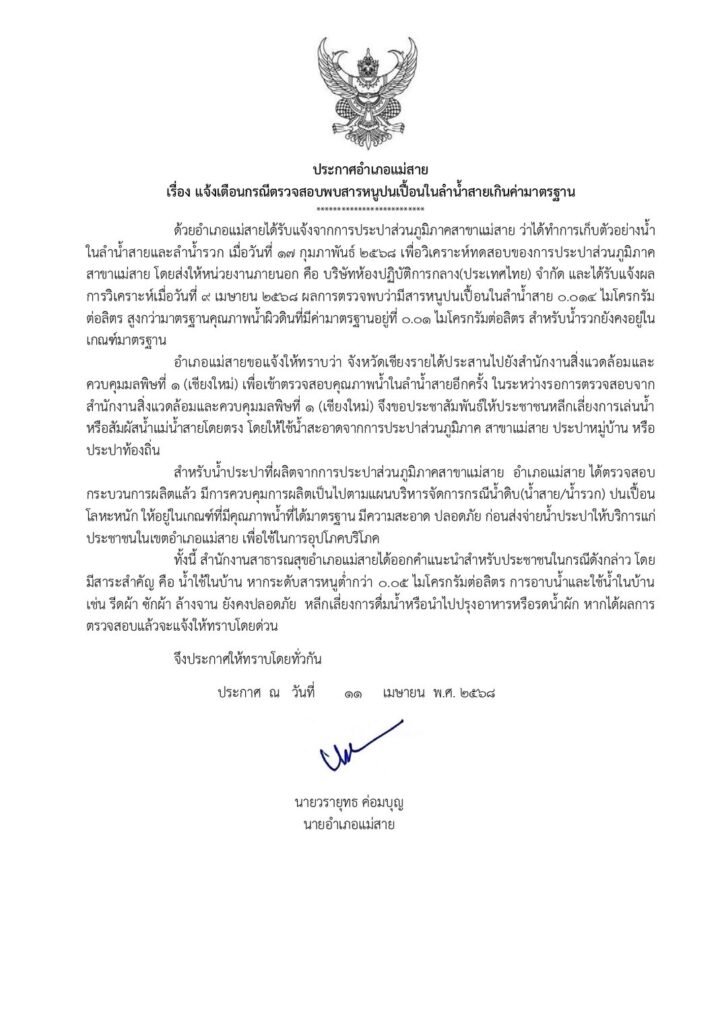 แจ้งข่าวสารประชาสัมพันธ์ประกาศของทางอำเภอแม่สาย กรณีตรวจสอบพบสารหนูปนเปื้อนในลำน้ำน้ำสายเกินค่ามามาตรฐาน