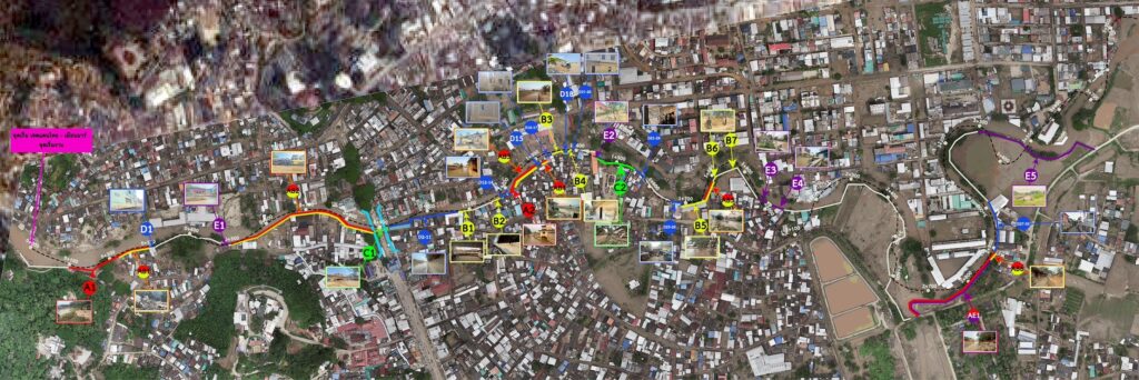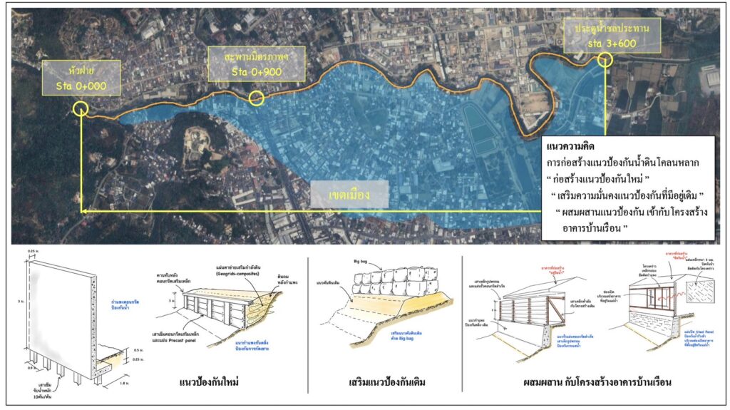 1. ต้องป้องกันน้ำได้ 2. เป็นแนวป้องกันน้ำชั่วคราว เพื่อสอดรับกับยแผนการทำพนังกั้นน้ำถาวร ในอนาคต 3. เป็นรูปแบบที่ก่อสร้างได้รวดเร็ว ทันเวลา โดยสามารถต้านทานน้ำได้ภายใน มิ.ย.68 ก่อนฤดูน้ำหลาก โดยแบ่งแนวป้องกันเป็น 5 รูปแบบ ผสมผสานให้เหมาะสมในแต่ละพื้นที่ ดังนี้ 1 .การสร้างแนวป้องกันใหม่ 2 รูปแบบ – เขื่อนป้องกันตลิ่ง เข็มไอ เสียบแผ่น precast คอนกรีตหล่อสำเร็จ – กำแพงป้องกันน้ำ คสล.พร้อมฐานราก 2. การเสริมความมั่นคงแนวป้องกันเดิม 1 รูบแบบ – BigBag เสริมแนวคันดินเดิม 3.การผสมผสานแนวป้องกันเข้ากับโครงสร้างอาคารบ้านเรือน 2 รูปแบบ – กำแพงป้องกันน้ำ เสาเหล็ก เสียบแผ่นคอนกรีตสำเร็จรูป – แผ่นเหล็กปิดช่องน้ำเข้า ตามอาคารริมน้ำ
