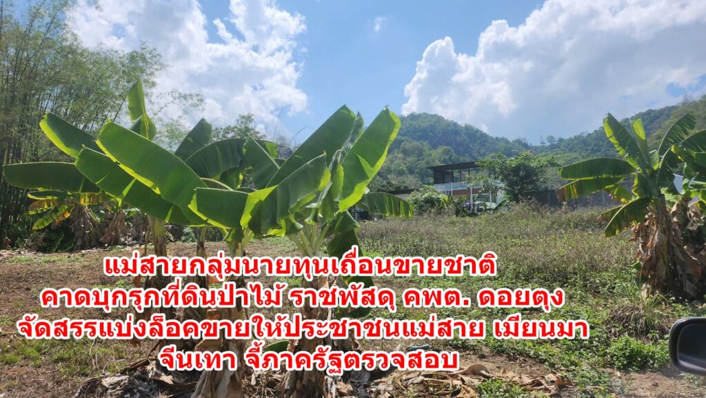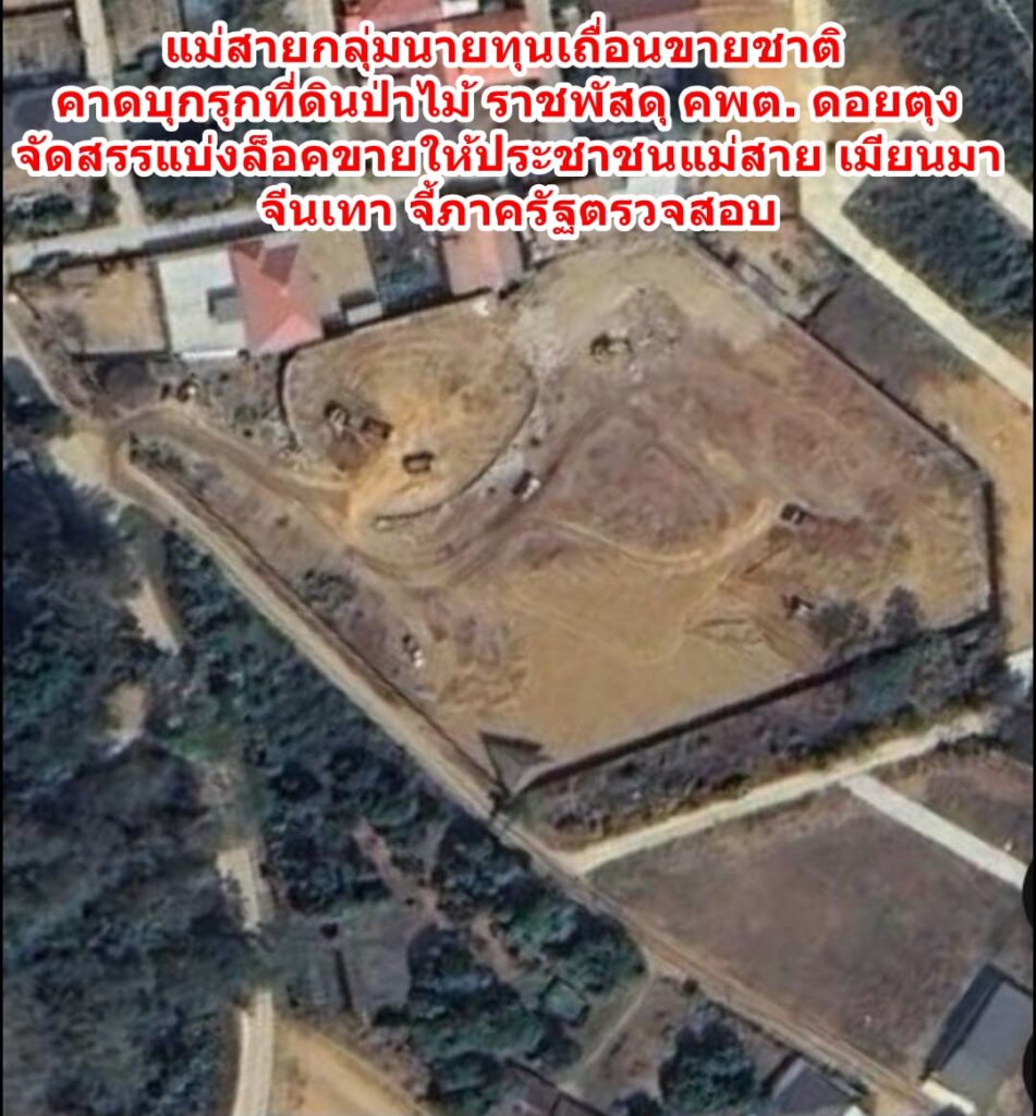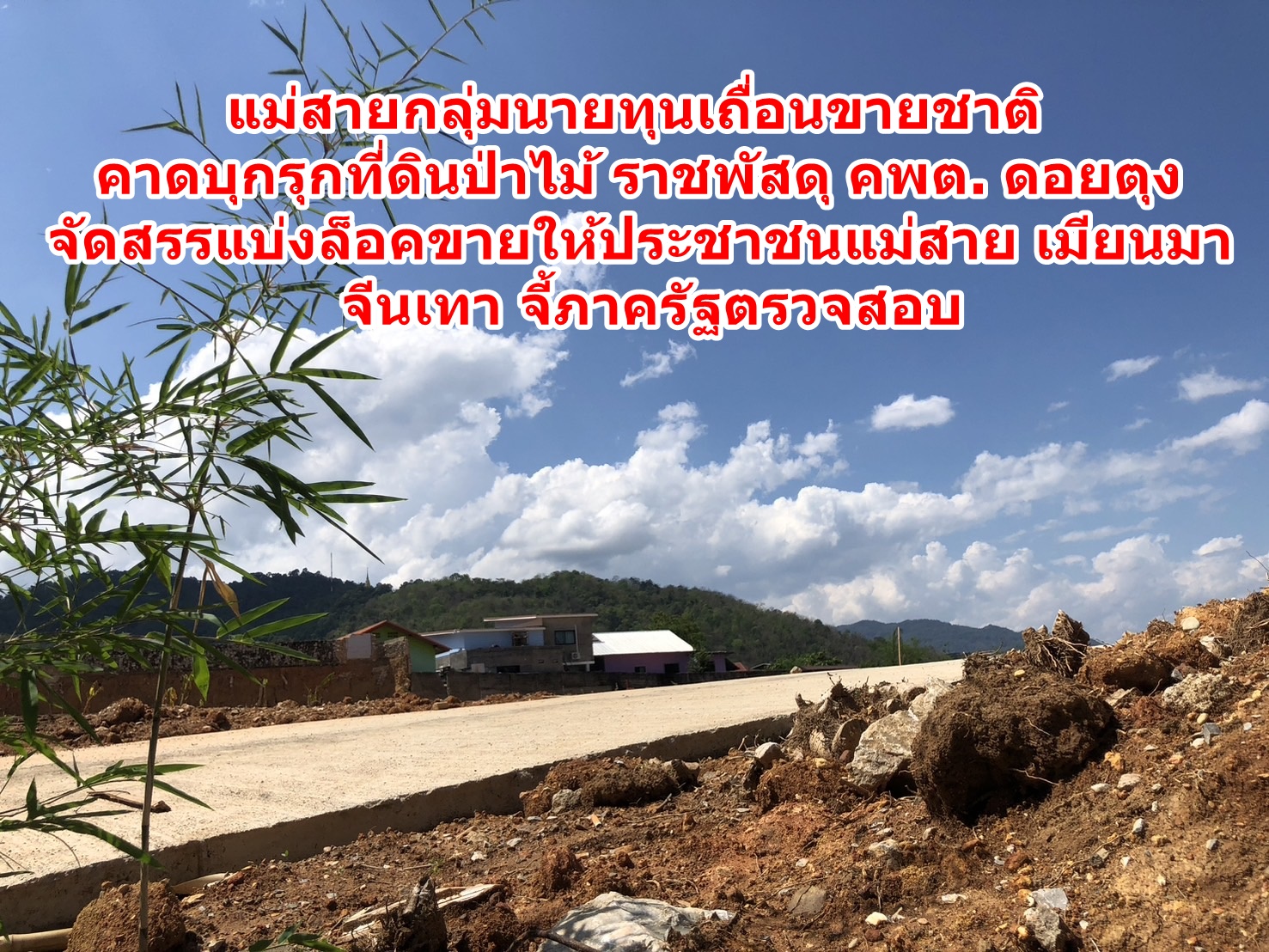 ในพื้นที่ อ.แม่สาย จ.เชียงราย ซึ่งมีพฤติกรรมของกลุ่มนายหน้าขายที่ดิน – และนายทุนเถื่อนขายชาติ – บุกรุกที่ดินป่าไม้ – ราชพัสดุ – คพต. ดอยตุง จัดสรรแบ่งล็อคขายให้ประชาชนแม่สาย – เมียนมา – จีนเทา ที่คาดว่ามีเจ้าหน้าที่ของรัฐบ้างหน่วยงานให้การช่วยเหลือและได้ผลประโยชน์.. ขายชาติ นำที่ของหลวงมาจัดสรรแบ่งล็อคขาย.. เพื่อได้ประโยชน์ของกลุ่มตน…