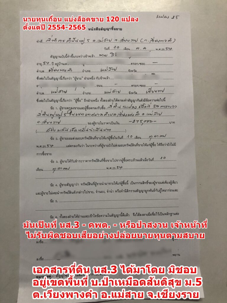 หลังจากที่สำนักข่าวแม่สายนิวส์ได้ลงเสนอข่าวปัญหาความเดือดร้อนของพีน้องประชาชนได้ที่ชื้อที่ดินโฉนด นส.3 จัดล็อคขาย จำนวน 120 แปลง ในพื้นที่แปลงละ 1 งาน เป็นจำนวนกว่า 30 ไร่ ในเขตพื้นที่ บ.ป่าเหมือดสันติสุข ม.5 ต.เวียงพางคำ อ.แม่สาย เริ่มต้นตั้งแต่ในราคา 350,000 บาท ไปถึง 800,000 บาท ตั้งแต่ปี 53 จนมาถึงปี 2566 กลุ่มผู้ชื้อที่ดินได้รับคำชักชวนแนะนำจากนายหน้าว่าที่ดิน ( เฮีย ว ) แบ่งล็อคขาย ดังกล่าวเป็นโฉนด นส.3 เมื่อชื้อจ่ายเงินหมดแล้วจะได้สิทธิ์ครอบครองตามที่ข้อตกลงกันเอาไว้ จนมาถึงปีนี้ 2568 กลุ่มผู้ชื้อที่ดินแบ่งล็อคขายทั้ง 120 แปลง ไม่มีใครได้โฉนดครอบครองแม้แต่คนเดียว ตามที่ข้อตกลงกันเอาไว้ – ไม่รู้ว่าโฉนด นส.3 แปลงดังกล่าวมีจริงหรือไม่ หรือเป็นโฉนด นส.3 ที่ได้มาโดยมิชอบด้วยกฎหมายหรือไม่ สร้างปัญหาความเดือดร้อนให้แก่กลุ่มผู้ชื้อที่ดินแบ่งล็อคขายทั้ง 120 แปลง นี้คือพฤติกรรมของกลุ่มขบวนการขายที่ดินเถื่อน.. ในพื้นที่ อ.แม่สาย จ.เชียงราย
