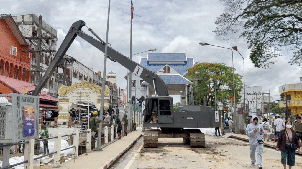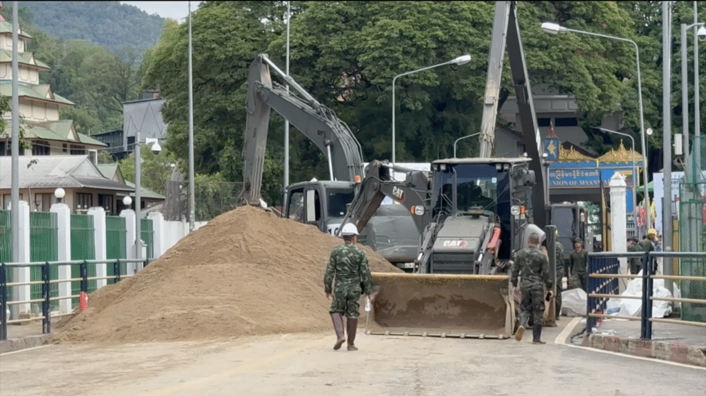 วันนี้ (24 พ.ค.) กรณีแม่น้ำสายได้เอ่อล้นเข้าท่วมริมฝั่งทั้ง อ.แม่สาย จ.เชียงราย และ จ.ท่าขี้เหล็ก ประเทศเมียนมา ตั้งช่วงเช้ามืดที่ผ่านมา พบว่าหลังจากมวลน้ำในรัฐฉาน ประเทศเมียนมา ได้ไหลทะลักผ่านชายแดนมาแล้ว 2 ระลอก พบว่าระดมน้ำค่อยๆ ทรงตัวและลดลงเล็กน้อย ขณะที่ พล.ท.สิรภพ ศุภวานิช เจ้ากรมการทหารช่าง นำเจ้าหน้าที่ทหารกรมการทหารช่างนำถุงทรายขนาดใหญ่หรือบิ๊กแบ็คไปวางตามจุดสำคัญๆ เพื่อไม่ให้น้ำทะลักเข้าท่วมชุมชนต่างๆ อีกตลอดแนว ตั้งแต่ชุมชนหัวฝาย ตลาดสายชมจอย ชุมชนเกาะทราย ฯลฯ โดยได้นำทราย รถแบคโฮและถุงบิ๊กแบ็คไปทำการบรรจุกั้นบริเวณคอสะพานมิตรภาพไทย-เมียนมา ข้ามแม่น้ำสายแห่งที่ 1 กระนั้นหลังจากปิดด่านพรมแดนตั้งแต่เวลา 06.30 น.แล้วได้กลับมาเปิดให้ผู้คนได้เดินทางเข้าออกชายแดนอีกครั้งในเวลาประมาณ 10.00 น.โดยให้เดินทางด้วยความระมัดระวังเพราะเจ้าหน้าที่และเครื่องจักรเครื่องมือกำลังทำงานอยู่บริเวณคอสะพานอยู่