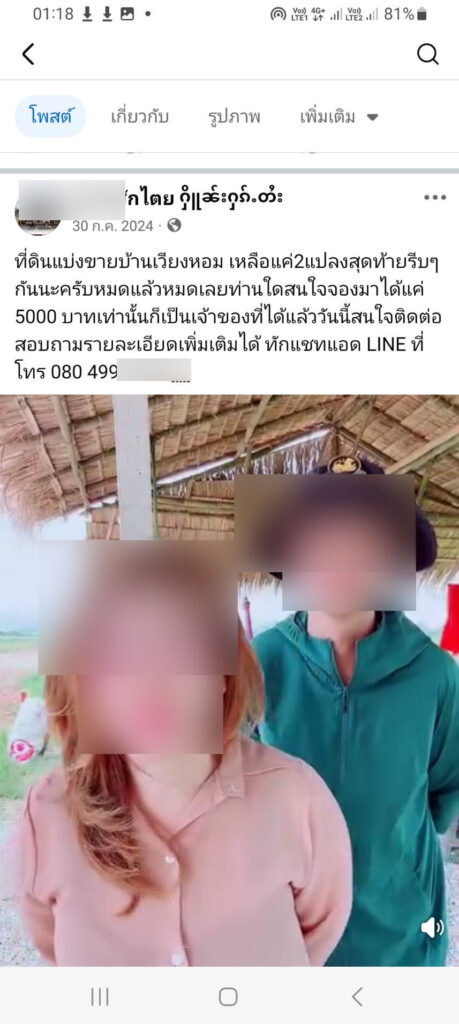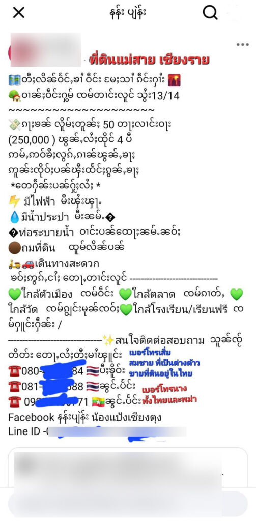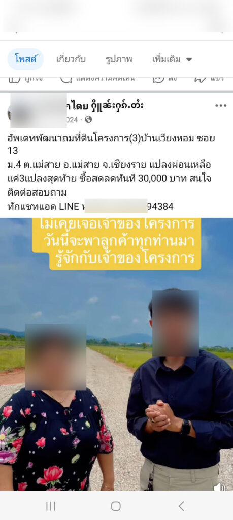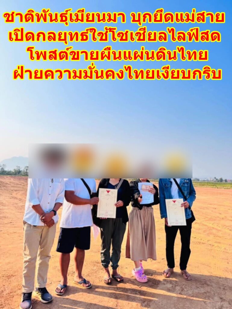 เมื่อวันที่ 22 พ.ค. 68 ที่ผ่านมา ตามกระแสข่าวช่องยูทูปของไทยนิวส์ และอีกหลายช่องได้เจาะลึกนำเสนอข่าวเกี่ยวกับมีกลุ่มชาติพันธุ์ของเมียนมาเปิดกลยุทธ์ใช้โซเชียลไลฟ์สดโพสต์ขายผืนแผ่นดินไทยกันอย่างมโหฬาร ทั้งเพจ-เฟสบุ๊ค-ยูทูป มากมายหลายช่องทางของกลุ่มอินฟลูเอนเซอร์ ที่มีผู้ติดตามหลักแสนคน ผู้ติดตามเพจส่วนใหญ่เป็น กลุ่มชาติพันธุ์ไทใหญ่-ไทยลื้อ ( ในท่าขี้เหล็ก-เชียงตุง-เมืองลา -เขตรัฐฉานฯลฯ จนไปถึงสิบสองปันนา ) และประชาชนชาวเมียนมา ซึ่งนายทุนจัดสรรที่ดินขายได้ใช้กลยุทธ์ โดยให้อินฟูเอนเซอร์หลายกลุ่มเข้ามาไลฟ์สดมาถึงบริเวณที่ดินจัดสรรแบ่งล็อคขายในพื้นที่ อ.แม่สาย ซึ่งจะมีการแบ่งเปอร์เซ็นต์ส่วนแบ่งเหมือนนายหน้าคนไทยทั่วไป ซึ่งอินฟูเอนเซอร์หรือกลุ่มนายหน้าชาติพันธุ์ของเมียนมาจะสื่อสารภาษาของชาติพันธุ์ให้เข้าใจง่ายเข้าถึง กลุ่มลูกค้าชาติพันธุ์ในเขตพื้นที่รัฐฉานต่างๆ ในประเทสเมียนมา ว่าถ้ามาชื้อที่ดินอยู่อาศัยใน อ.แม่สาย จ.เชียงราย แล้วจะสดวกสบาย เดินทางข้ามด่านพรมแดนไม่กี่นาทีก็ถึงแล้ว และที่สำคัญได้กล่าวว่า บ้านเมืองในเมียนมาตอนนี้ไม่มีความปลอดภัยเพราะมีการสู้รบกันอย่างเนื่อง ( และชายฉกรรจ์ต้องถูกจับไปเกณฑ์เป็นทหาร ) และสาธารณูปโภคในฝั่งไทยดีกว่าเยอะ จึงเป็นจุดขายไฮไลท์ทีเด็ดของอินฟูเอนฯ ของกลุ่มชาติพันธุ์เมียนมา ที่นำเสนอขายผืนแผ่นดินไทย ทั้งชื้อสด และชื้อผ่อน ตามโครงการจัดสรรขายที่ดินที่มีกลยุทธ์ต่างๆนาๆ ที่ผ่านมาระยะเวลา 4-5 ปี ได้มีกลุ่มชาติพันธุ์ของเมียนมาเข้ามาชื้อที่ดินแล้วเป็นจำนวนมาก โดยจะใช้สิทธิ์ที่ดินเป็นชื่อของญาติ-หรือเป็นคนที่รู้จัก – และนอมีนี เพื่อที่จะได้มาสร้างบ้านอยู่อาศัย หรือว่าเก็งกำไรเอาไว้ขายต่อ ซึ่งตามหลักกฎหมายของประเทสไทย คนต่างด้าวที่ทำงานในเมืองไทย และอาศัยอยู่เมียนมา ไม่สามารถซื้อและผ่อนที่ดินจัดสรรได้ในประเทศไทย (ได้จริงหรือไม่อย่างไร) ซึ่งหากมีการซื้อขายกันจริง ก็คาดว่าจะเป็นการหลอกซื้อขายที่ดิน ทั้งที่ต่างด้าวไม่สามารถซื้อขายที่ดิน หรือผ่อนชื้อที่ดินในประเทศไทยได้