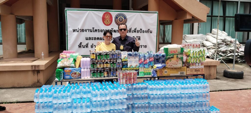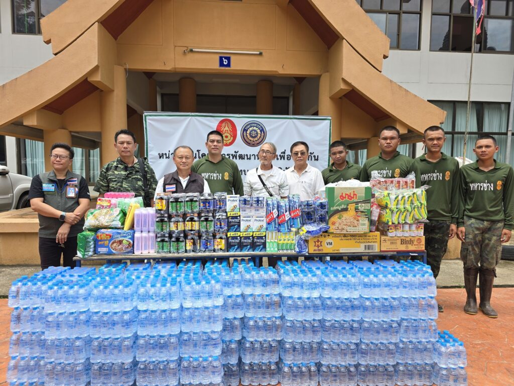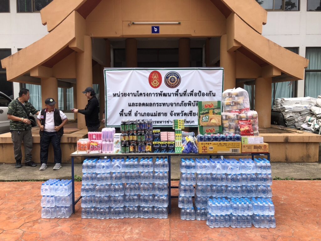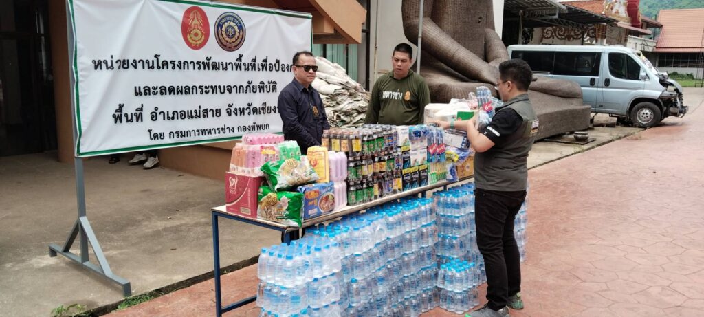 ได้นำสิ่งของอุปโภคบริโภคต่างๆ เช่น ปลากระป๋อง มาม่า สบู่ ยาสีฟัน แปรงสีฟัน เครื่องดื่มชูกำลัง และสิ่งของอาหารกระป๋องต่างๆ เพื่อไปมอบให้เป็นขวัญกำลังใจ แก่เหล่าๆ ทหารช่าง ( จำนวนกำลังพล 120 ) ที่กำลังเร่งปฏิบัติหน้าที่ ก่อสร้างแนวผนังป้องกันกั้นน้ำสาย – ขุดลอก แม่น้ำสาย – แม่น้ำรวก ให้ทันเวลาก่อนจะถึงฤดูน้ำหลาก ในพื้นที่ อ.แม่สาย จ.เชียงราย