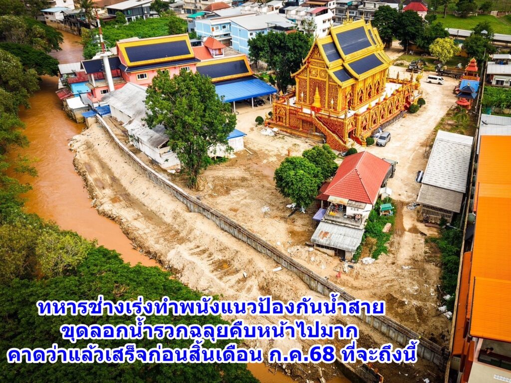 วันนี้ ( 13 มิ.ย.68 ) เจ้าหน้าที่ทหารกรมการทหารช่างได้นำเครื่องจักรอุปกรณ์พร้อมกำลังพลเข้ารื้ออาคารและก่อสร้างผนังแนวกั้นน้ำสูง 3 เมตร ตลอดแนวแม่น้ำสายอย่างต่อเนื่อง โดยปัจจุบันก่อสร้างชุมชนหัวฝ่ายเรื่อยมาจนถึงสะพานมิตรภาพไทย-เมียนมา ข้ามแม่น้ำสายแห่งที่ 1 และหลังแล้วเสร็จจะก่อสร้างต่อไปจนถึงสะพานมิตรภาพไทย-เมียนมา ข้ามแม่น้ำสายแห่งที่ 2 รวมระยะทางประมาณ 3 กิโลเมตรต่อไป ทั้งนี้การก่อสร้างมีความคืบหน้าโดยรวม ( ณ วันที่ 12 มิ.ย. 68 ) 61.04% ตามโครงการที่ได้ว่างเอาไว้ ในส่วนของการขุดลอกแม่น้ำสาย-แม่น้ำรวก ทางประเทศไทยรับผิดชอบในการขุดลอกแม่น้ำรวก ระยะทางรวม 32 กิโลเมตร กองทัพภาคที่ 3 รับผิดชอบ 14 กิโลเมตรแรกพบว่ามีความคืบหน้าไปแล้ว 46.60% และกรมการทหารช่างรับผิดชอบ 18 กิโลเมตรหลัง มีความคืบหน้าโดยรวม ( ณ วันที่ 12 มิ.ย. 68 ) 56.88% ขณะที่การขุดลอกแม่น้ำสายที่อยู่ในความรับผิดชอบของประเทศเมียนมาระยะทาง 12.8 กิโลเมตร มีความคืบหน้าไปเพียง 2.89%